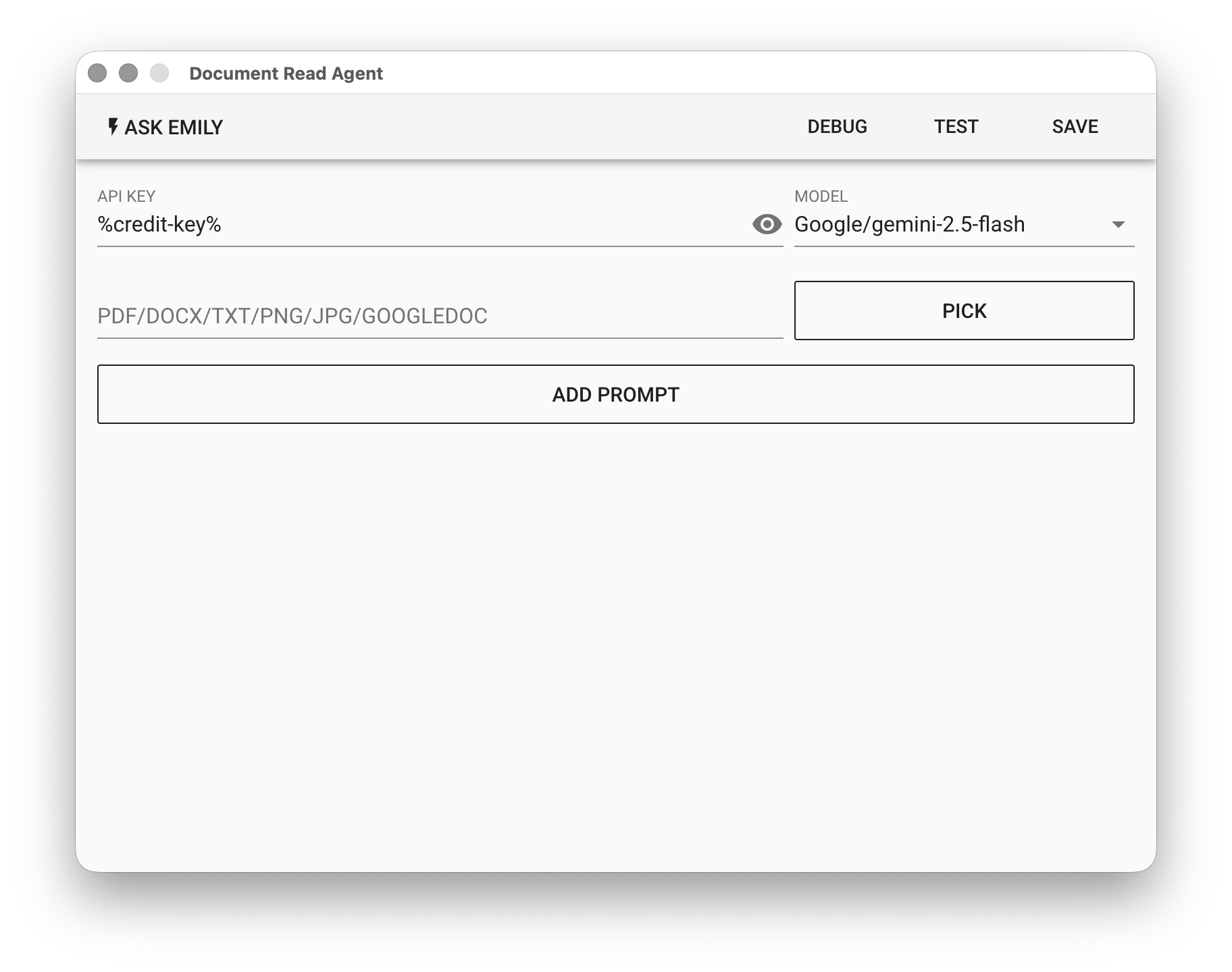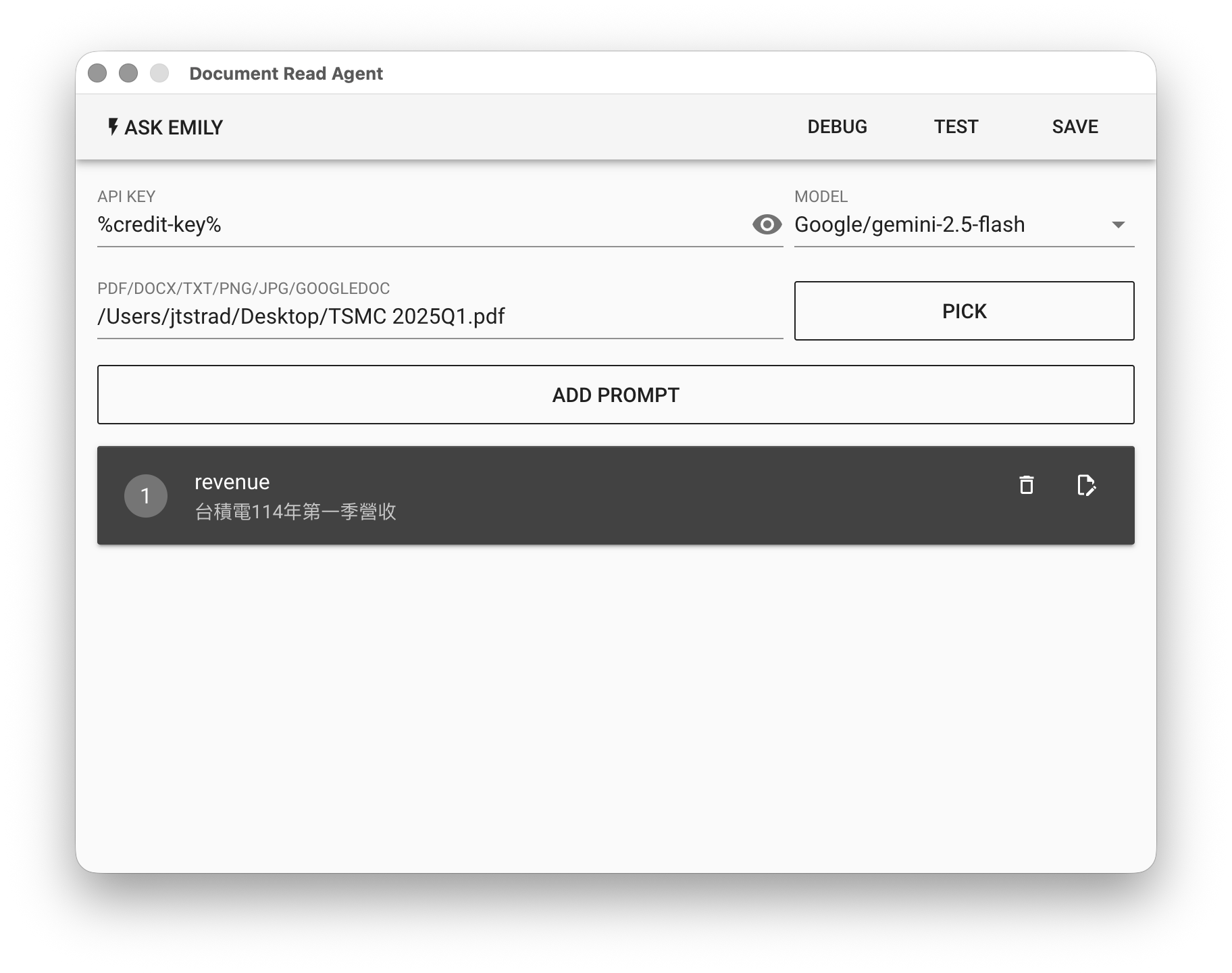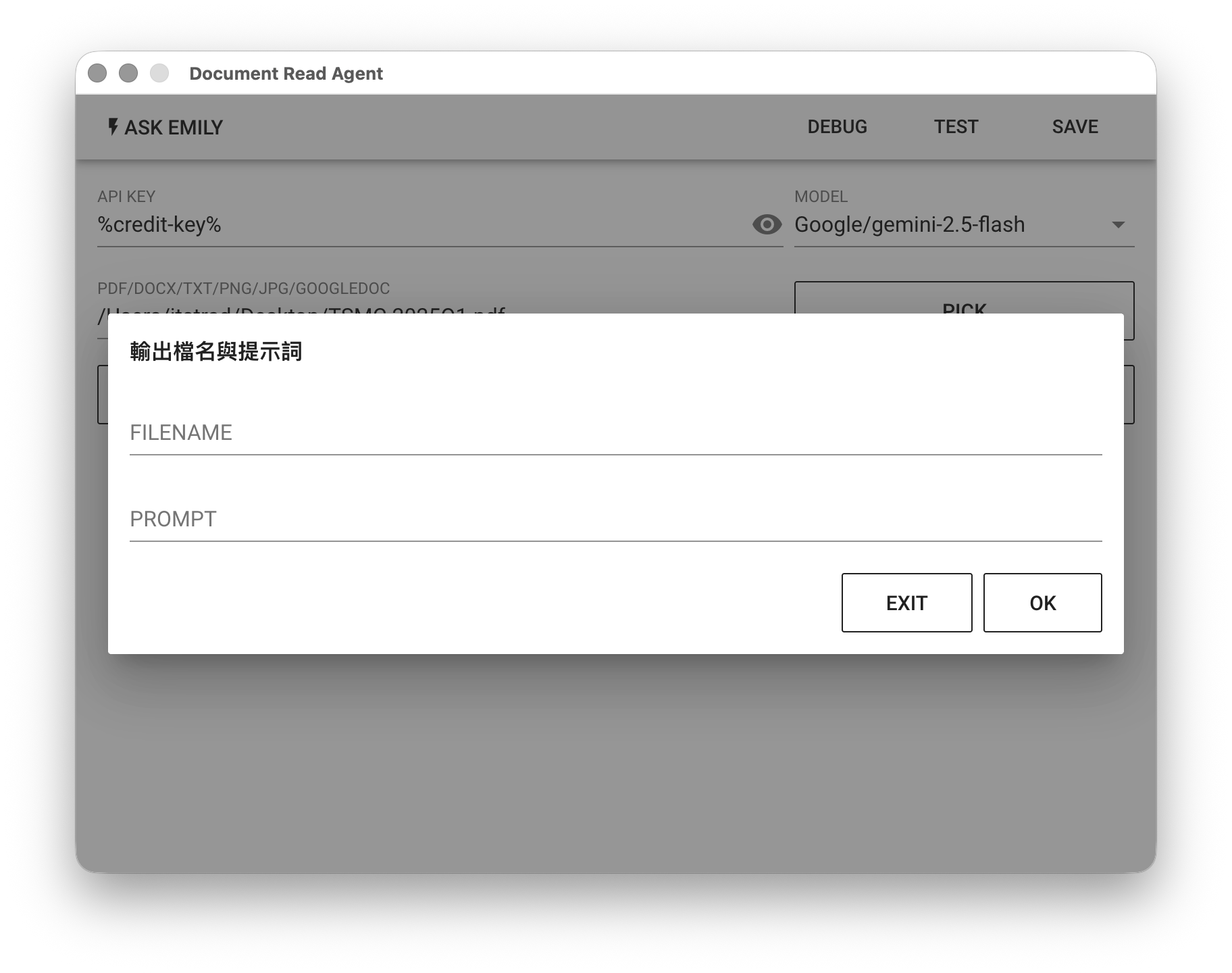 Document Read Agent 使用大型語言模型(LLM)擷取文件中的資訊,並將結果輸出至工作資料夾的文檔。GPT 模型在解析 PDF 檔案中文本資料是採取文本分析,而 Gemini 模型則是將 PDF 檔案中所有資料都視為圖像分析。如果不熟悉如何提示語言模型達成任務目標,可以善用「Ask EMILY」讓 AI 生成友善語言模型的目標提示。