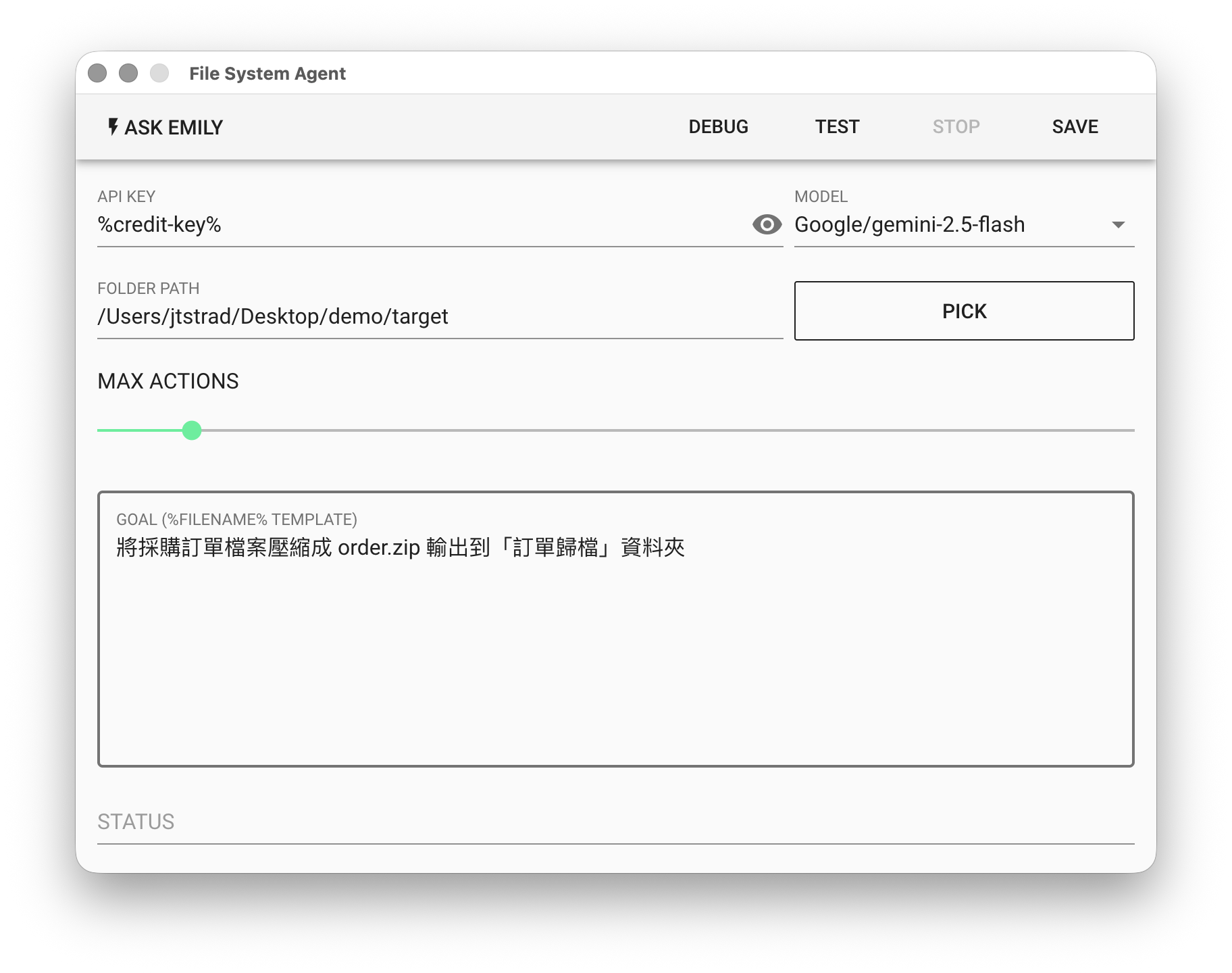 File System Agent 使用自然語言描述任務目標,並透過大型語言模型(LLM)自主操作檔案系統指定資料夾,包括讀取、寫入、刪除檔案等。需注意越大的目標語言模型越容易產生誤判,也會使用更多的 Token,建議拆解成多個小任務來降低失敗率。如果不熟悉如何提示語言模型達成任務目標,可以善用「Ask EMILY」讓 AI 生成友善語言模型的目標提示。