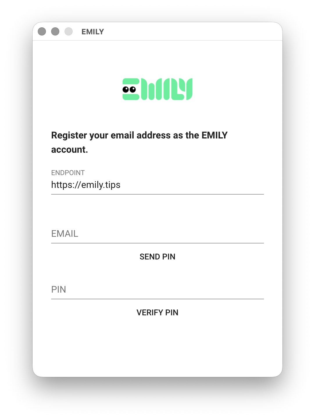 After installing the downloaded software, the first screen you see will look like the image below. The ENDPOINT field is pre-filled with https://emily.tips as the license server endpoint and does not need to be changed. If your organization uses an on-premises deployment, the endpoint should be the same website from which you downloaded the installer and must be entered manually.