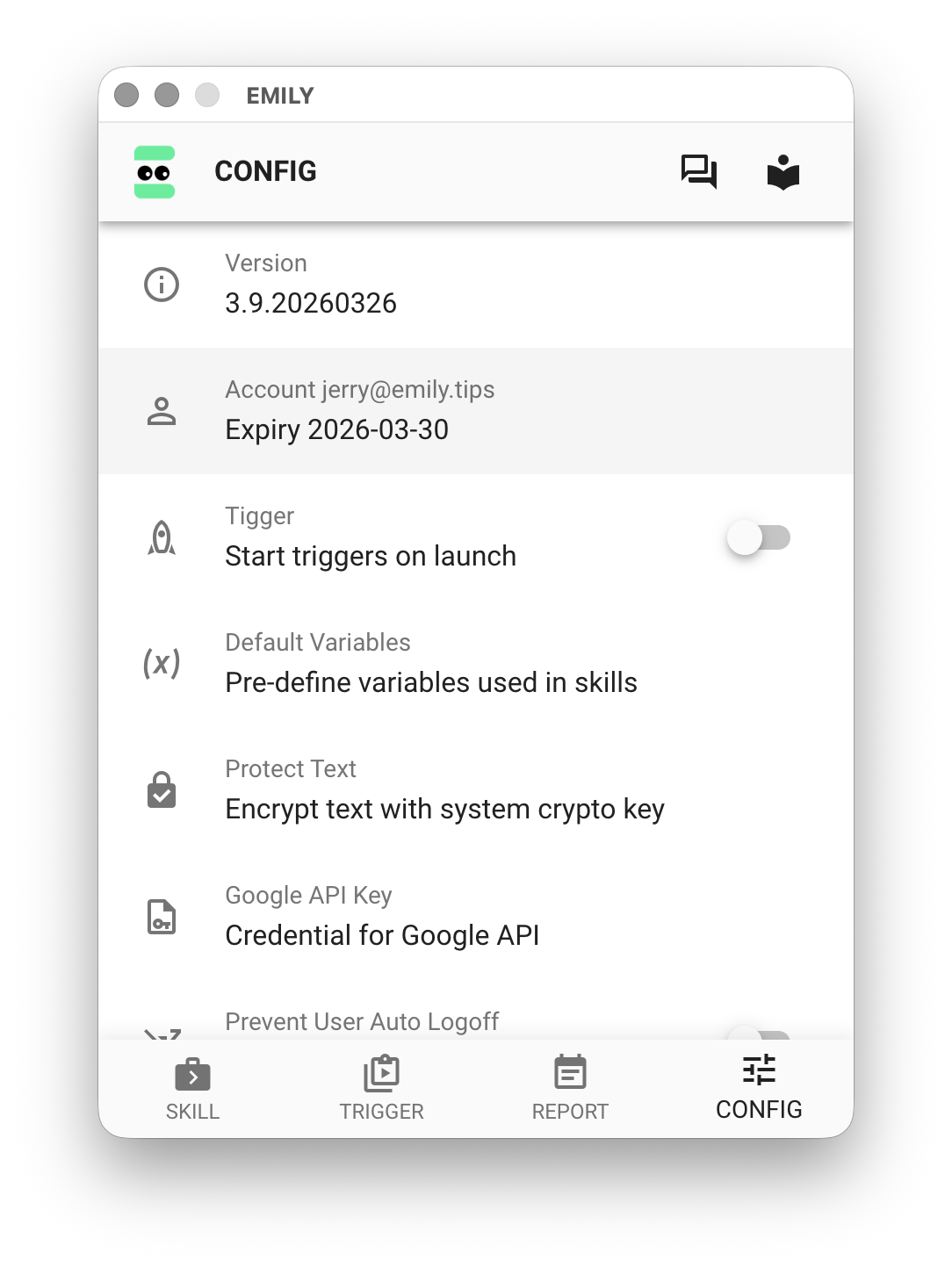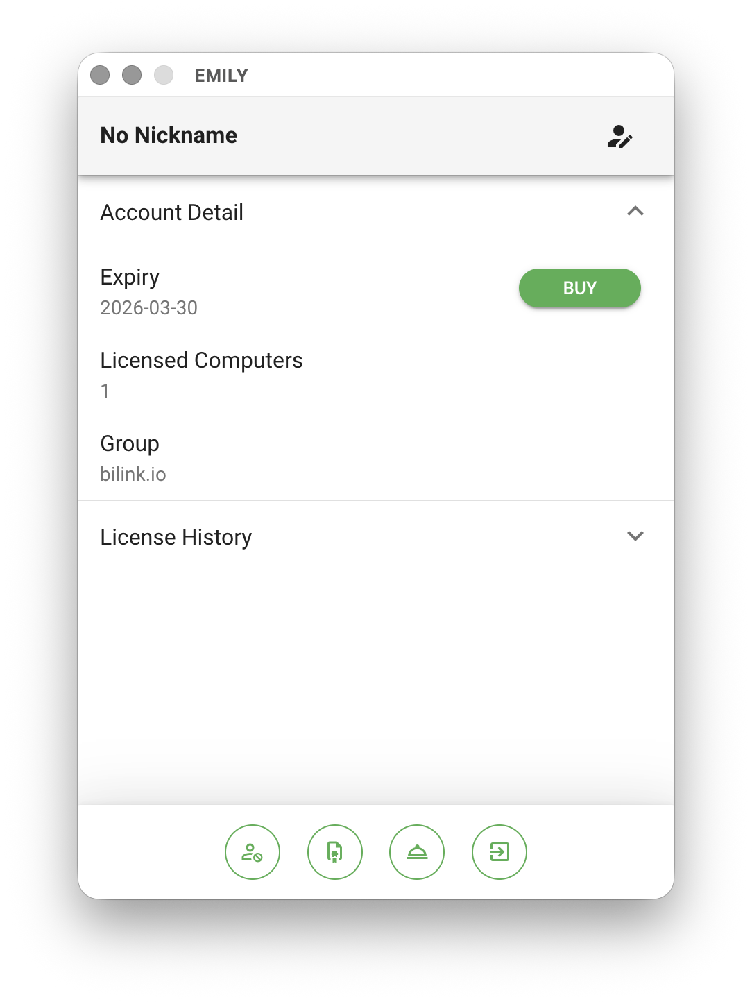 At the top of the Account Details page, you can set a nickname for your bot. Below that, you will find the expiration date and an option to purchase a license online. "Licensed Devices" indicates how many computers can run EMILY.RPA simultaneously under your account. By default, each account has one license, meaning only one computer can run EMILY.RPA at a time. There is no restriction if the bot is started on different computers at different times. The "Group" section below is an enterprise feature — accounts within the same group can share automation workflows, which we call "Skills".