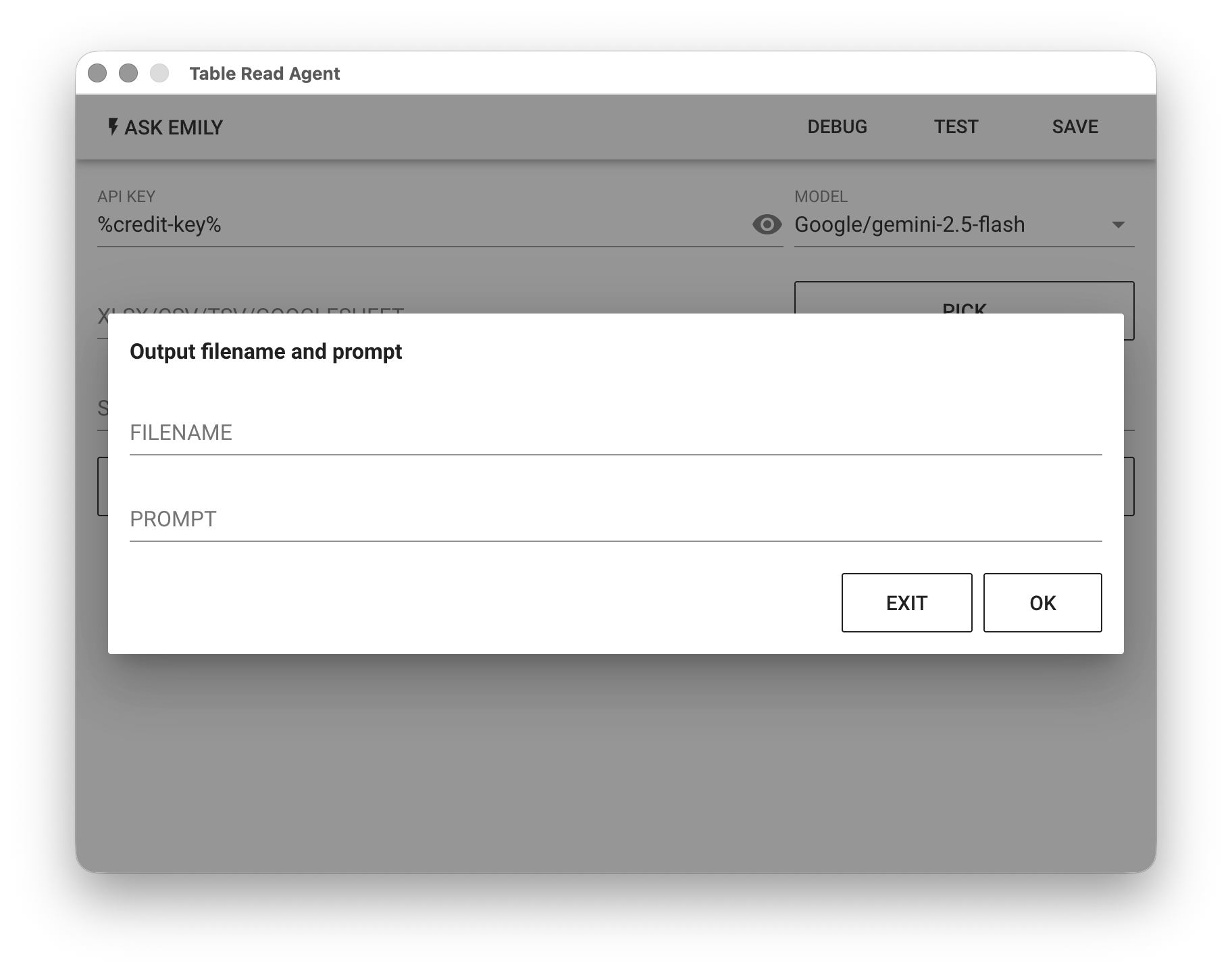 Table Read Agent uses a large language model (LLM) to extract information from spreadsheets and outputs the results to files in the working folder. If you're unfamiliar with how to prompt the language model to achieve task goals, use "Ask EMILY" to let the AI generate model-friendly goal prompts.