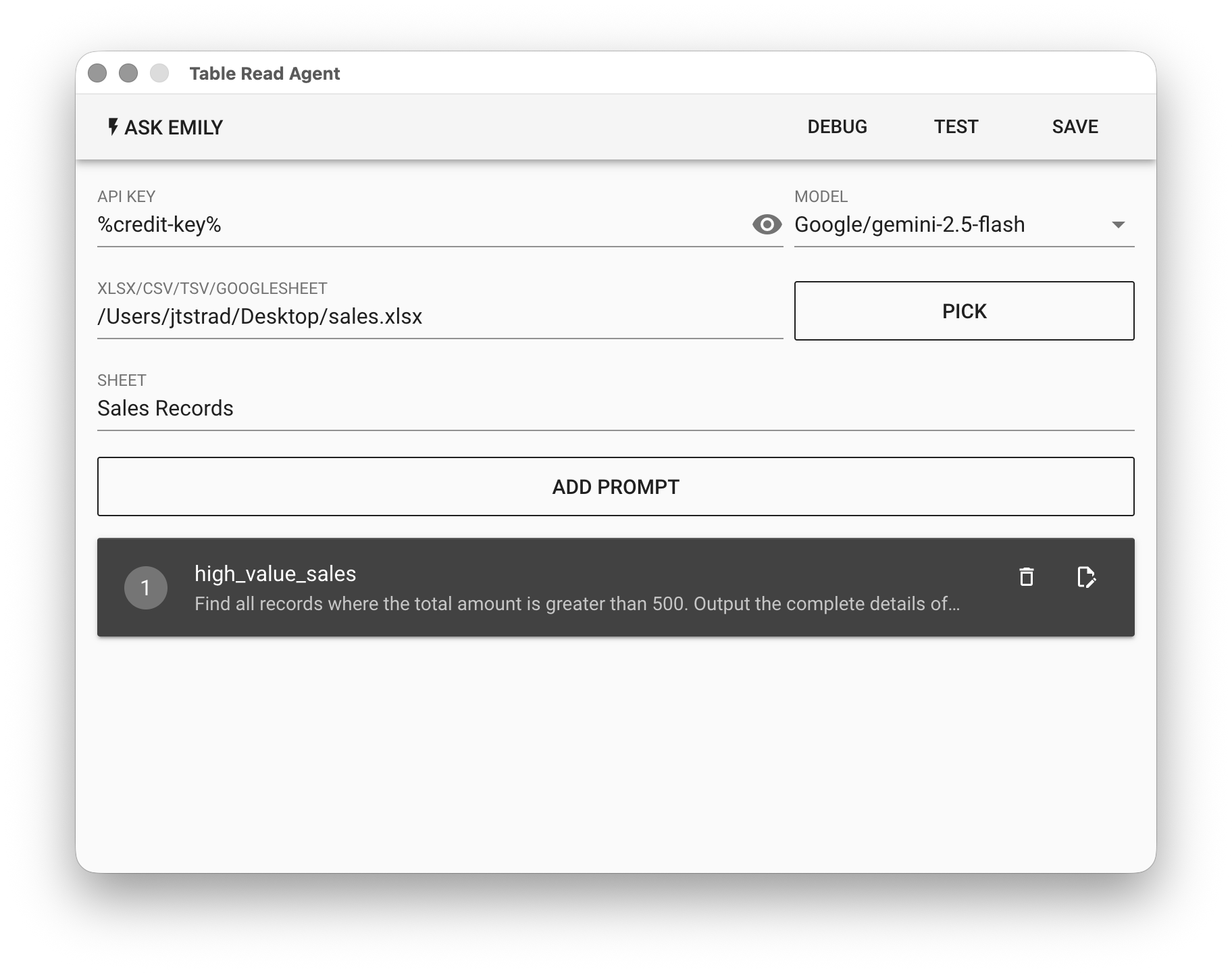 For the Table Read Agent, select the model Google/gemini-2.5-flash and add a prompt with filename high_value_sales.txt and prompt: Find all records where the total amount is greater than 500...