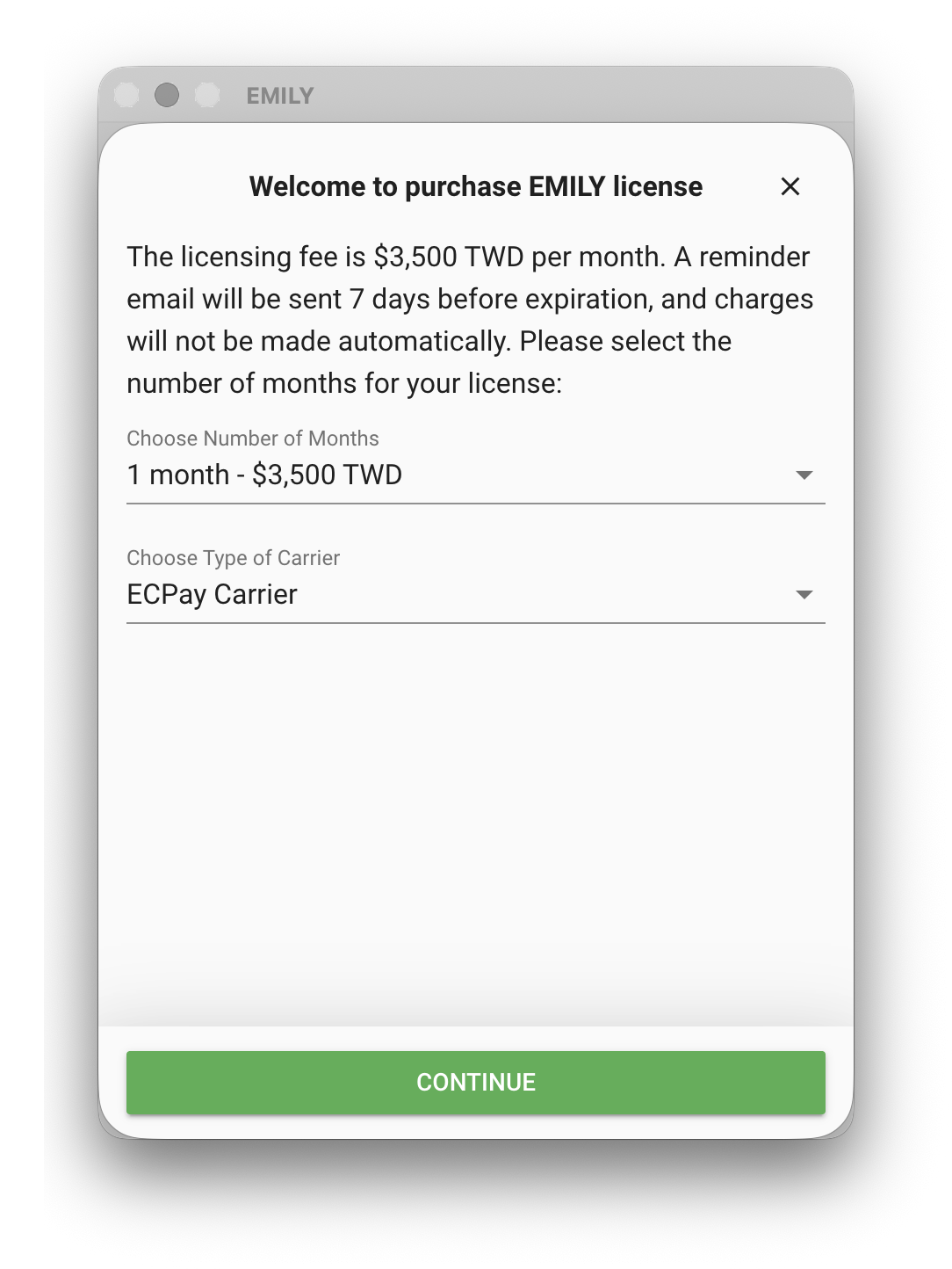 "Purchase License" allows a one-time online credit card purchase of an account license. You can choose the license duration, and you will only be notified upon expiration — there is no automatic charge. If you need an invoice for reimbursement, you can select a tax ID number under "Select Carrier", or choose a carrier for lottery purposes.