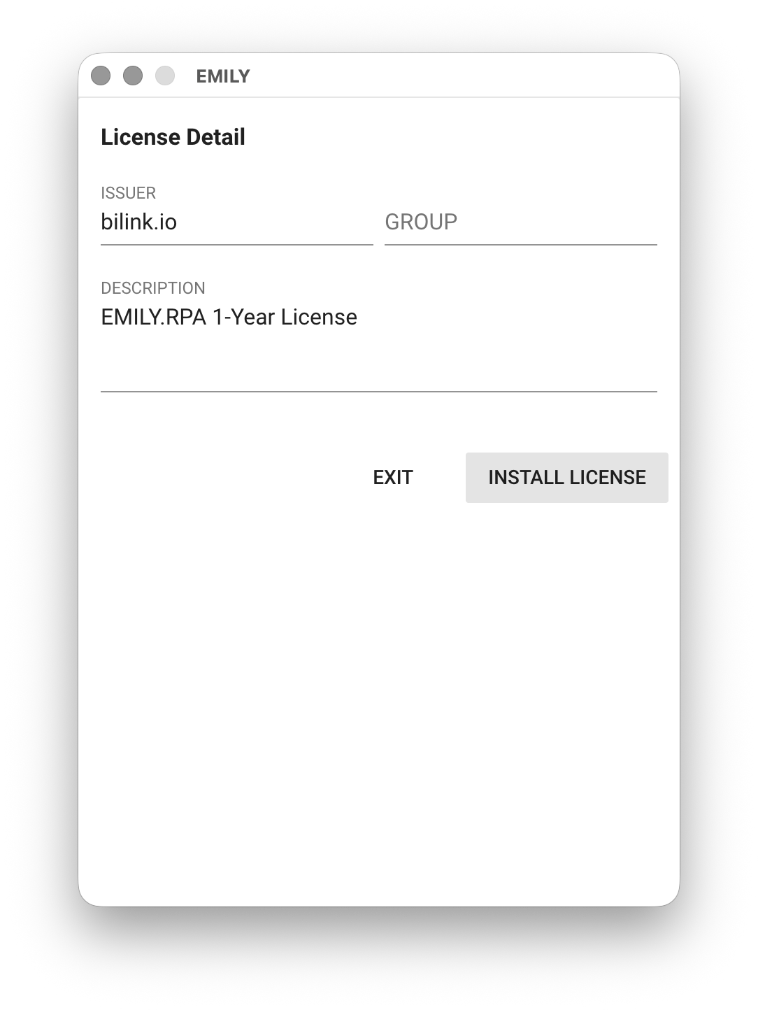 Clicking the account item opens the account details page, which includes "Expiration Date", "Licensed Computers", "Group", and "License History". Licensed Computers and Group require an enterprise plan to configure. The default number of licensed computers is one, meaning EMILY.RPA can only be open on one computer at a time. The Group feature provides skill sharing and permission management across multiple accounts in an enterprise — contact your sales representative for details.