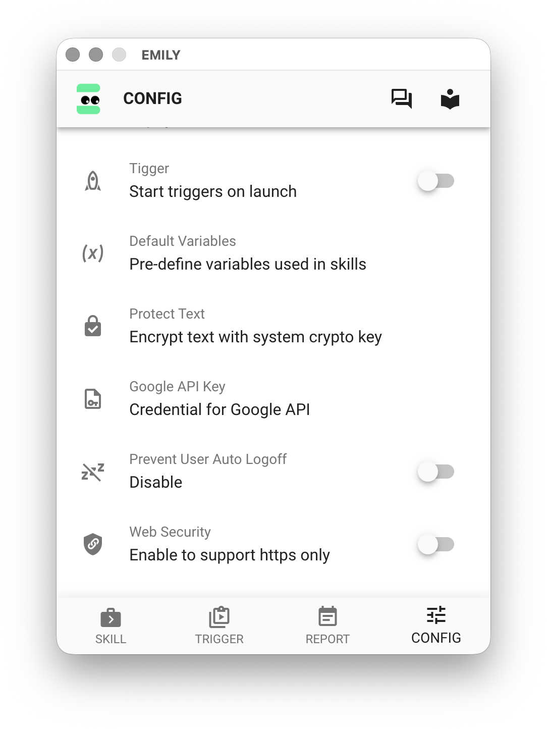 When the "Enter Fully Automated Mode on Startup" toggle is turned on, EMILY.RPA will enter fully automated mode directly the next time it launches. Combined with the operating system's "Auto Login on Boot" and "Launch Application on Startup" settings, this achieves the goal of having EMILY.RPA run fully automated as soon as the computer boots up.