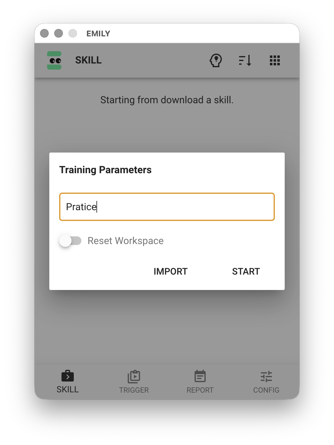 First, click the "Train Skill" icon at the top of the "My Skills" page. In the "Training Mode Settings" dialog, enter Practice Skills in the Skill Group field — this will categorize the skill we're about to create under the Practice Skills group. You don't need to check "Clear Working Folder" since the Training Mode working folder tmp should be empty at this point. Then click "Start".