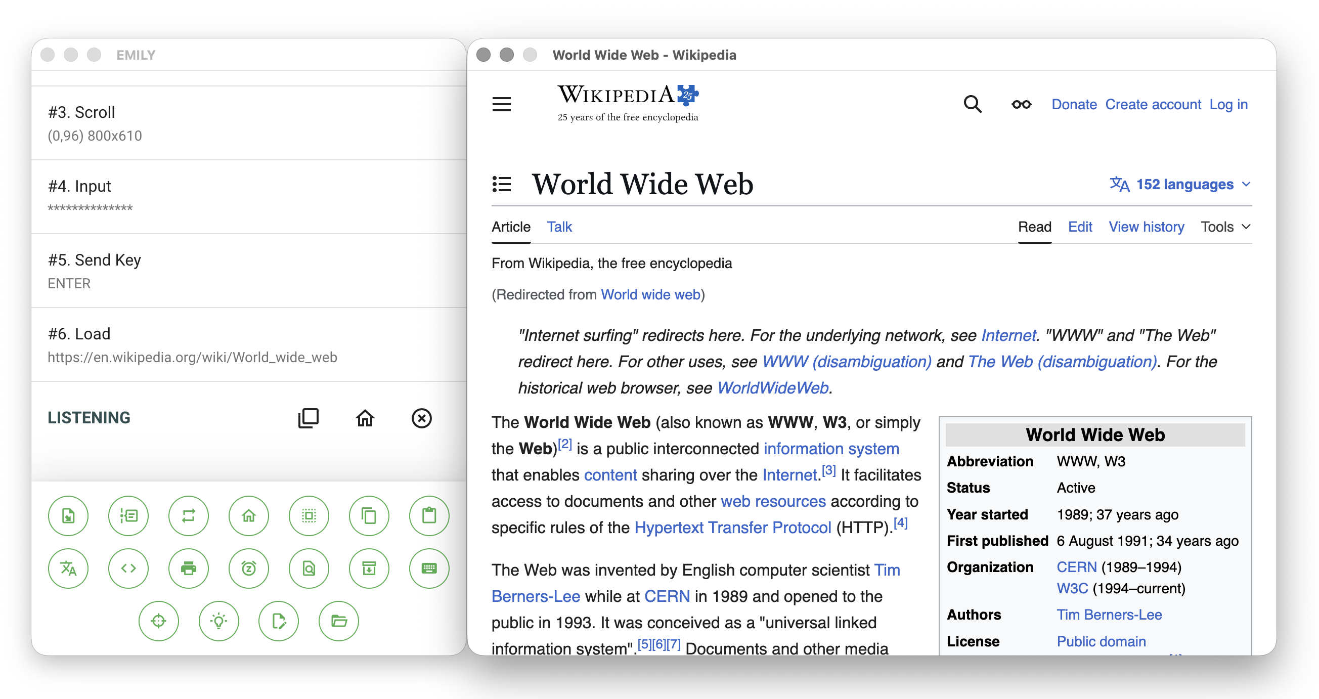 Now let's interact with the webpage and let EMILY.RPA record every step of the interaction. Make sure the keyboard cursor is in the webpage's search box. If it isn't, click the center of the search box to place the cursor there, then type world wide web.
