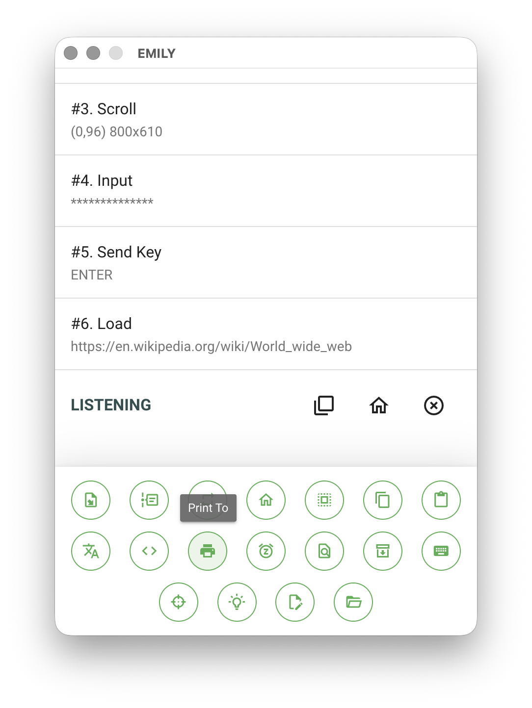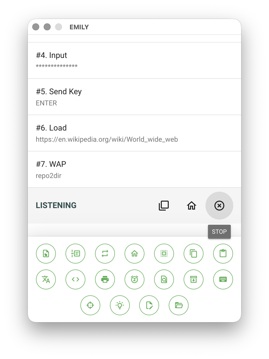 After clicking the "SAVE" button in the automation module, the main interface adds the module as a command in the workflow. EMILY.RPA skills describe workflow operations through the recording of various commands. A workflow can consist of multiple websites and multiple automation modules with no quantity limit, making it possible to complete complex and lengthy tasks. Once all commands have been recorded, click "Finish".