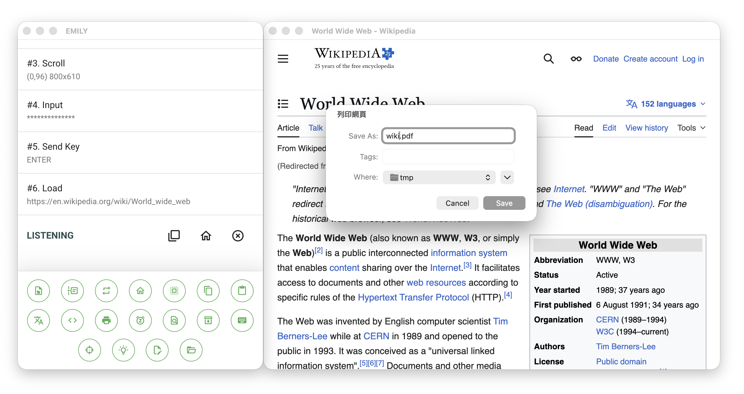 Now let's design a simple skill hands-on. First, we'll go to the Wikipedia website at https://www.wikipedia.org/ to search for the keyword world wide web, then save the search results as a PDF file, and finally place it on the desktop. This skill will use web automation to operate the EMILY.RPA browser, as well as an automation module to copy the file to the desktop. Through this exercise, you'll quickly understand how the design mode works.