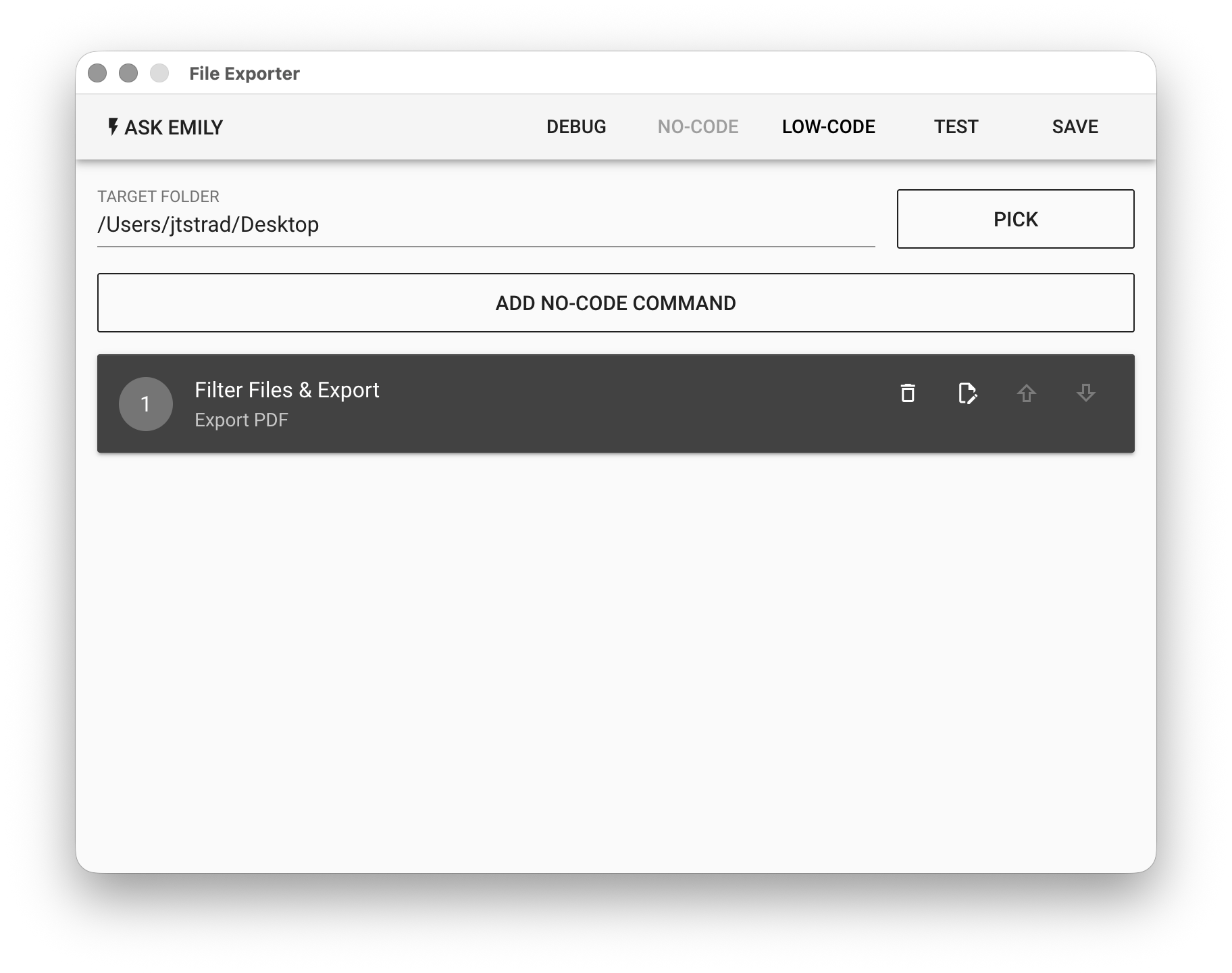 In the "Export Working Folder" module interface, first click the "PICK" button and select the Desktop folder as the export destination. Then click "ADD NO-CODE COMMAND" and choose the "Filter Files then Export" command. In the HINT field, enter something descriptive like Export output PDF. In the FILTER field below, enter wiki.pdf, then click "OK".