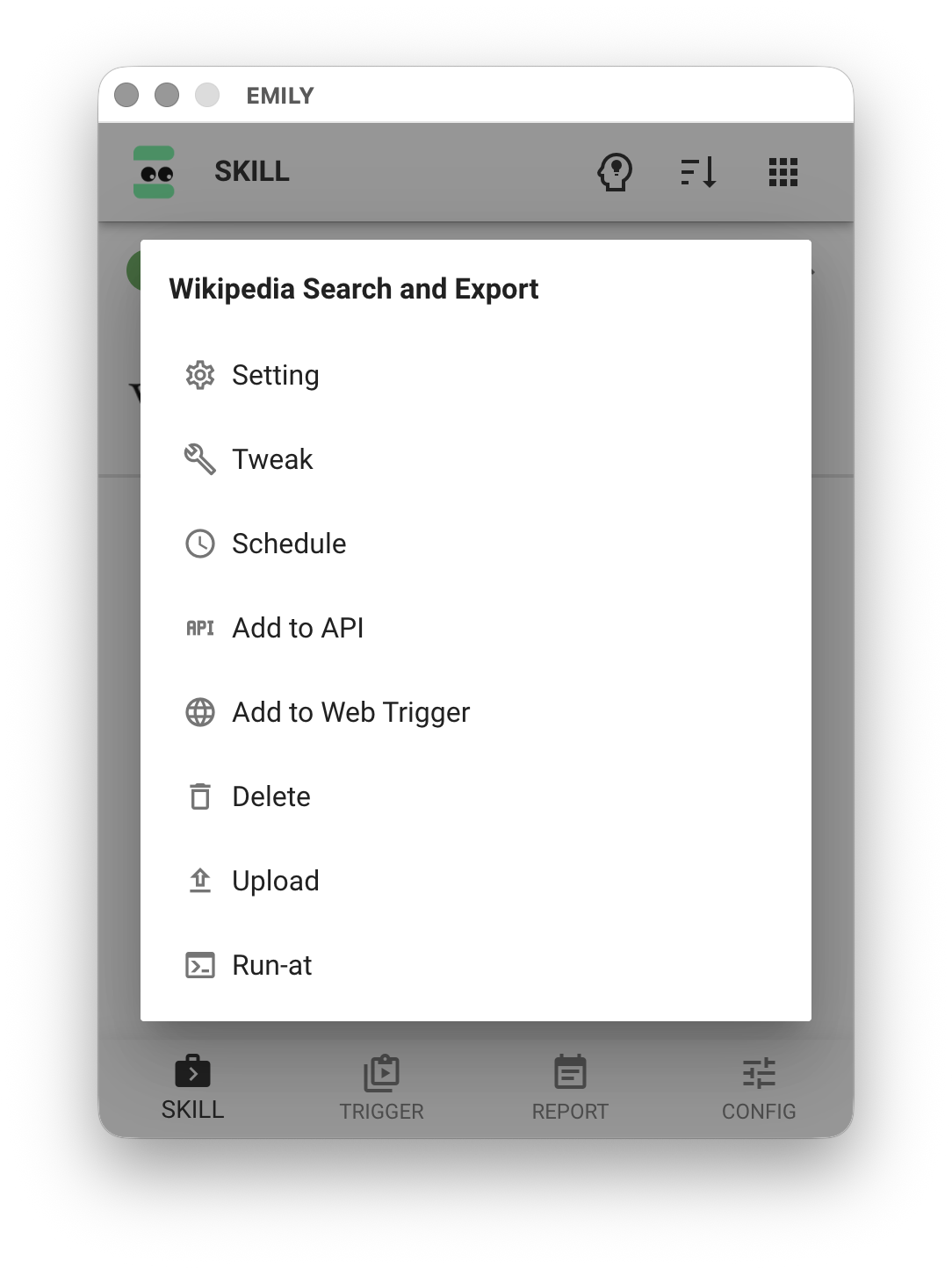 Alternatively, clicking the skill item itself opens a menu with management functions for that skill, such as: "Settings" for name, description, group, and input files; "Adjust" to add or delete commands in the workflow; trigger the skill via schedule, API, or web trigger; "Delete" the skill (but you can re-download a backed-up version from the Skill Hub); "Upload" the updated skill to the cloud Skill Hub; and finally, execute the skill with a specified working folder.