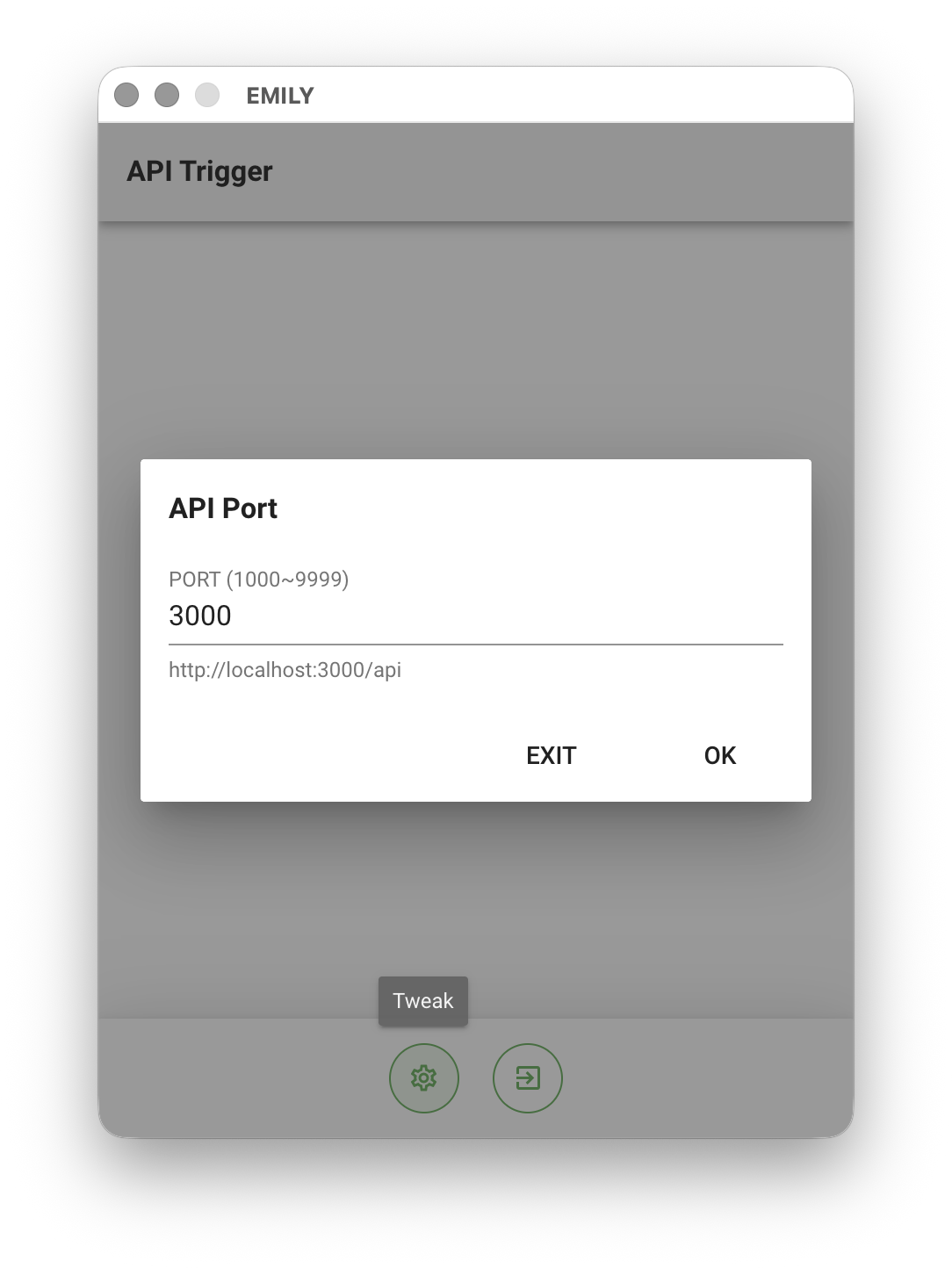 Click the "Adjust Parameters" icon at the bottom of the interface to open the "API Port" dialog. The API server defaults to port 3000. If it conflicts with another server, you can change it — for example, to 3002 — then click "OK".