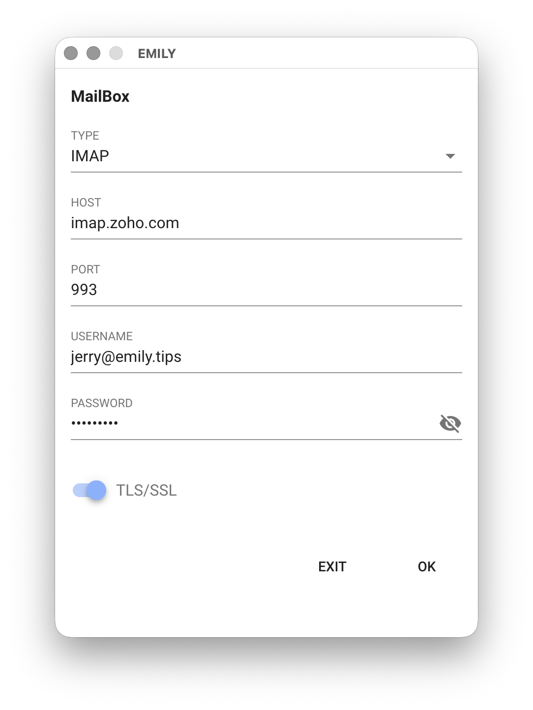 HOST and PORT are the IMAP mail server hostname and port number, for example imap.zoho.com / 993 — confirm with your mail server administrator. USERNAME and PASSWORD are the account name and password configured on the mail server; the username is usually the same as the email address. The TLS/SSL option indicates whether the connection to the mail server requires encryption.