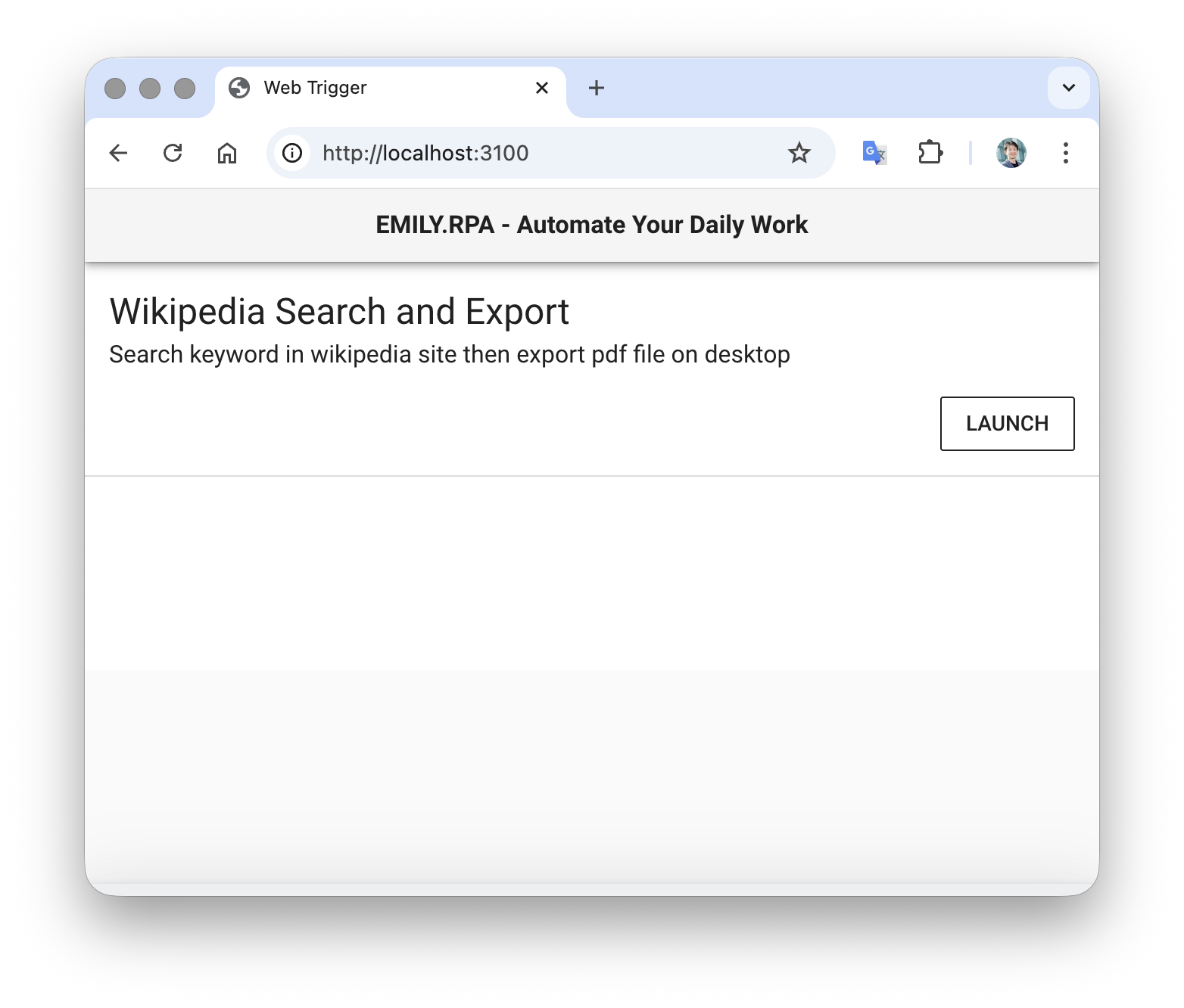 Web Trigger turns EMILY.RPA into a web server, allowing users to trigger specified skills from other devices by loading the webpage in a browser. This requires a static IP address or hostname, and you must ensure that the requesting device can reach the local machine through the firewall.