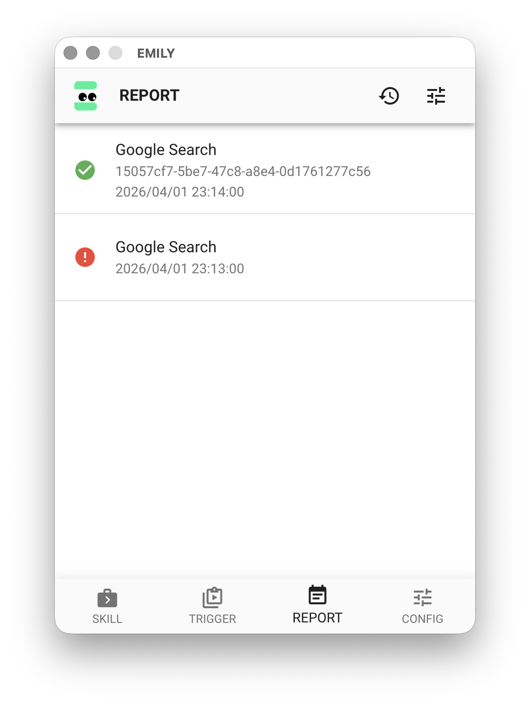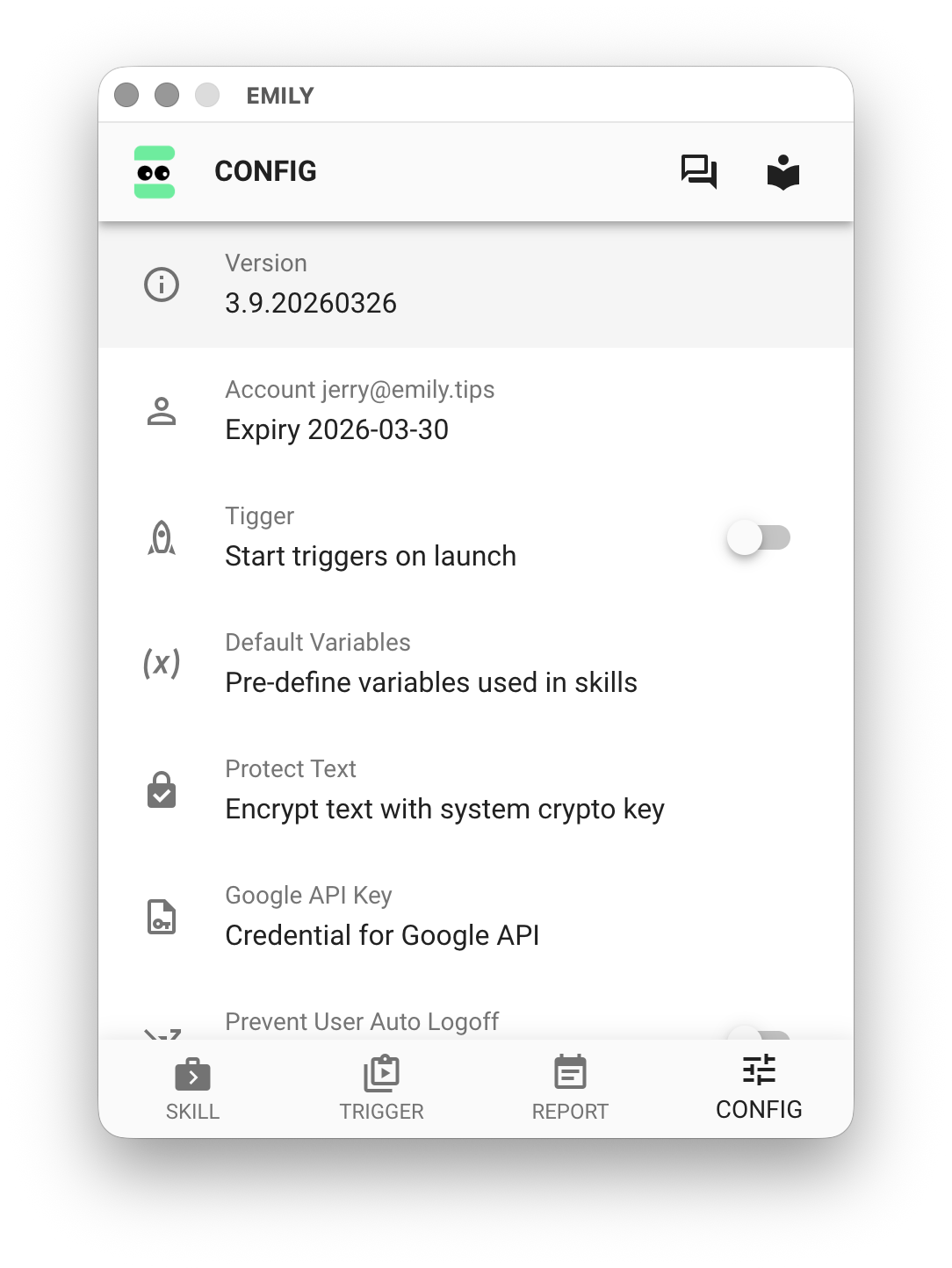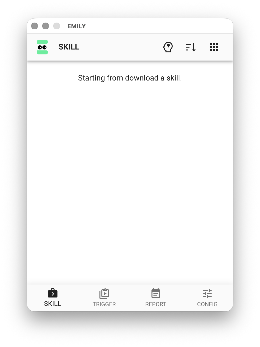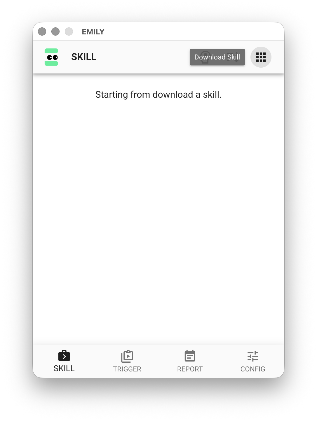 The footer of the EMILY.RPA main interface serves as the primary navigation area, allowing you to switch between four pages: "SKILL", "TRIGGER", "REPORT", and "CONFIG". The header and content change accordingly. As information accumulates with use, you can drag the left or right edge of the window to increase its width, but the height is fixed.