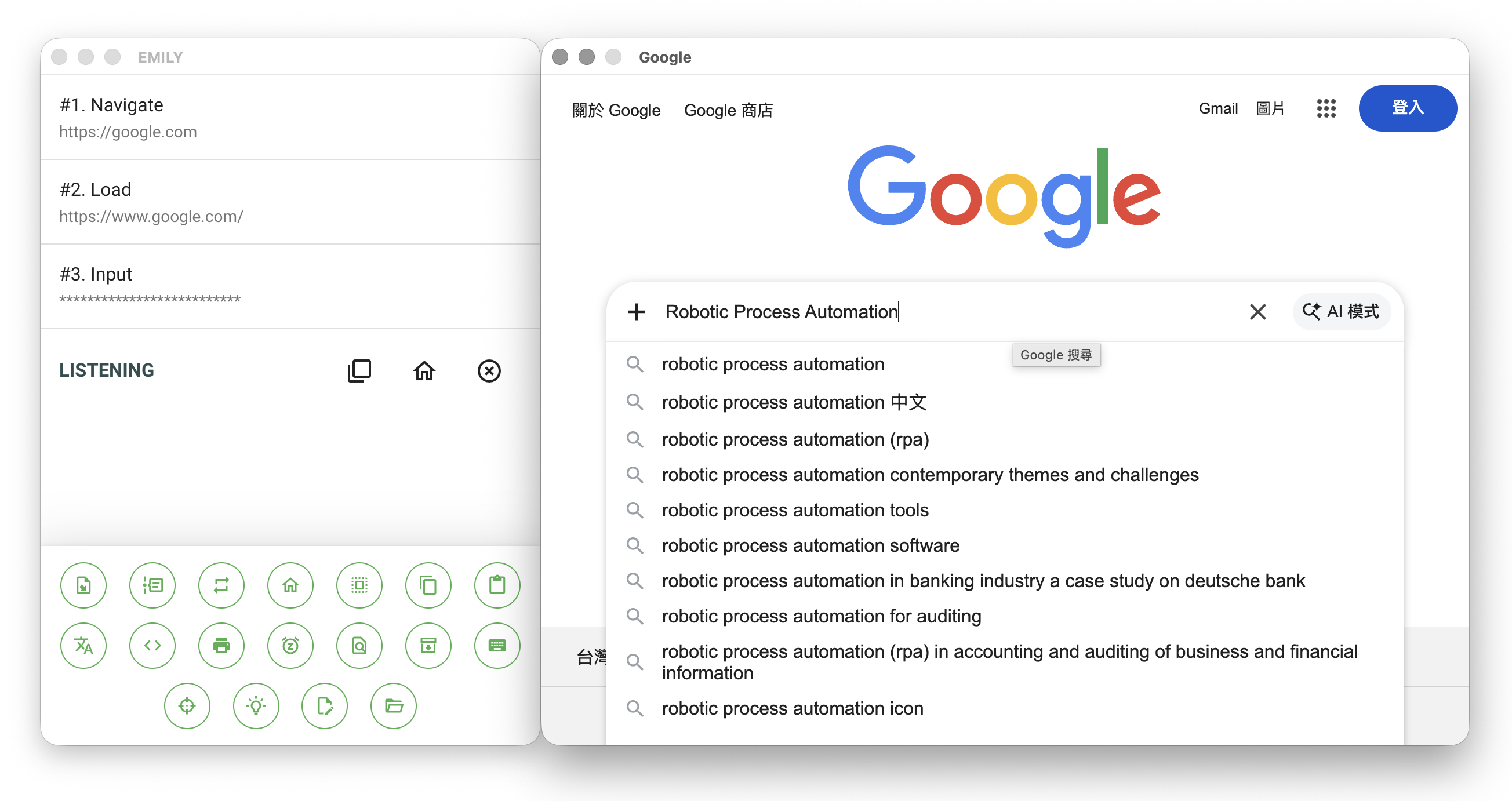 After completing the "Training Parameters", a training browser window opens. You can enter the target webpage URL in the address bar to begin designing a web automation workflow, or select an automation module below. At this point, the main interface switches to functions for adding, editing, and deleting workflow steps.