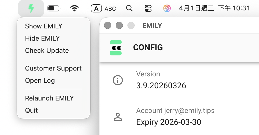 On macOS, you can find a lightning bolt icon in the menu bar at the top of the desktop; on Windows, it appears in the system tray at the bottom. Clicking the icon opens a menu that lets you "Show" or "Hide" the EMILY.RPA interface, allowing you to use the desktop while EMILY.RPA runs in the background. Note that when running Desktop Automation, EMILY.RPA takes control of the mouse and keyboard — if the user is also operating the desktop, this will cause interference and likely lead to automation failures. The "Check for Updates" option in the menu immediately checks for new versions; EMILY.RPA also checks automatically on launch. Clicking "Customer Support" opens a web page where users can submit support requests, limited to non-technical issues such as product usage and billing.