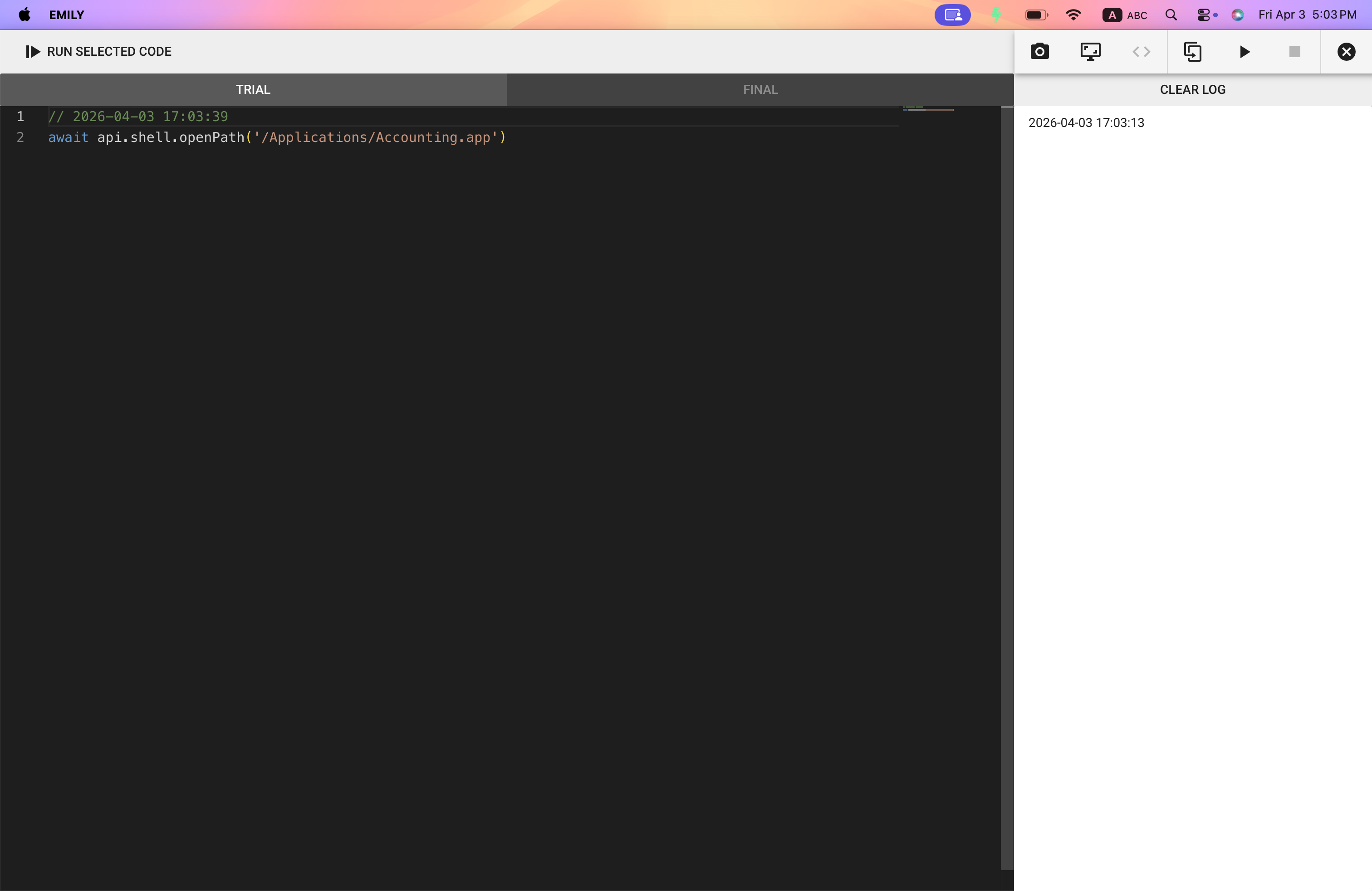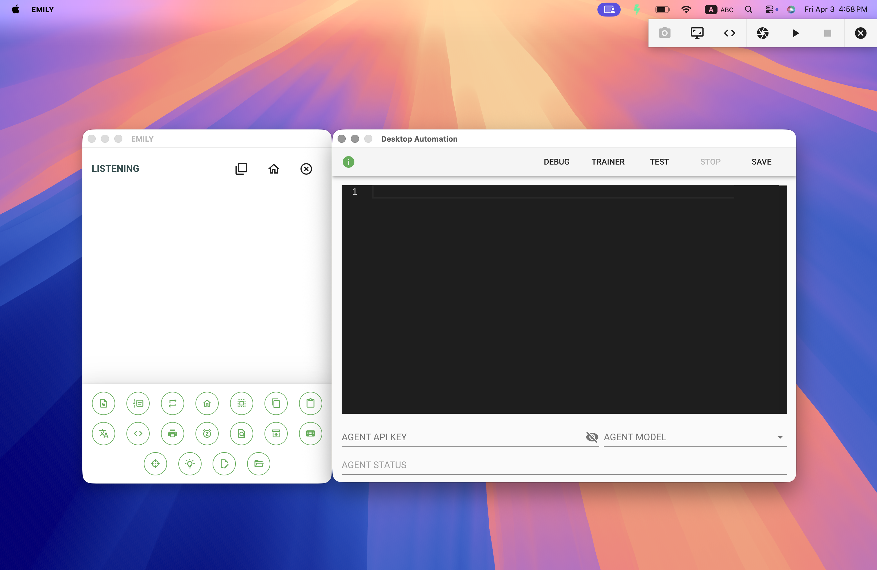 Click the "▶︎" play button on the training panel, and EMILY.RPA will automatically switch to desktop mode and start executing the Low-Code code. Press the "■" stop button or "Shift+ESC" to interrupt execution.