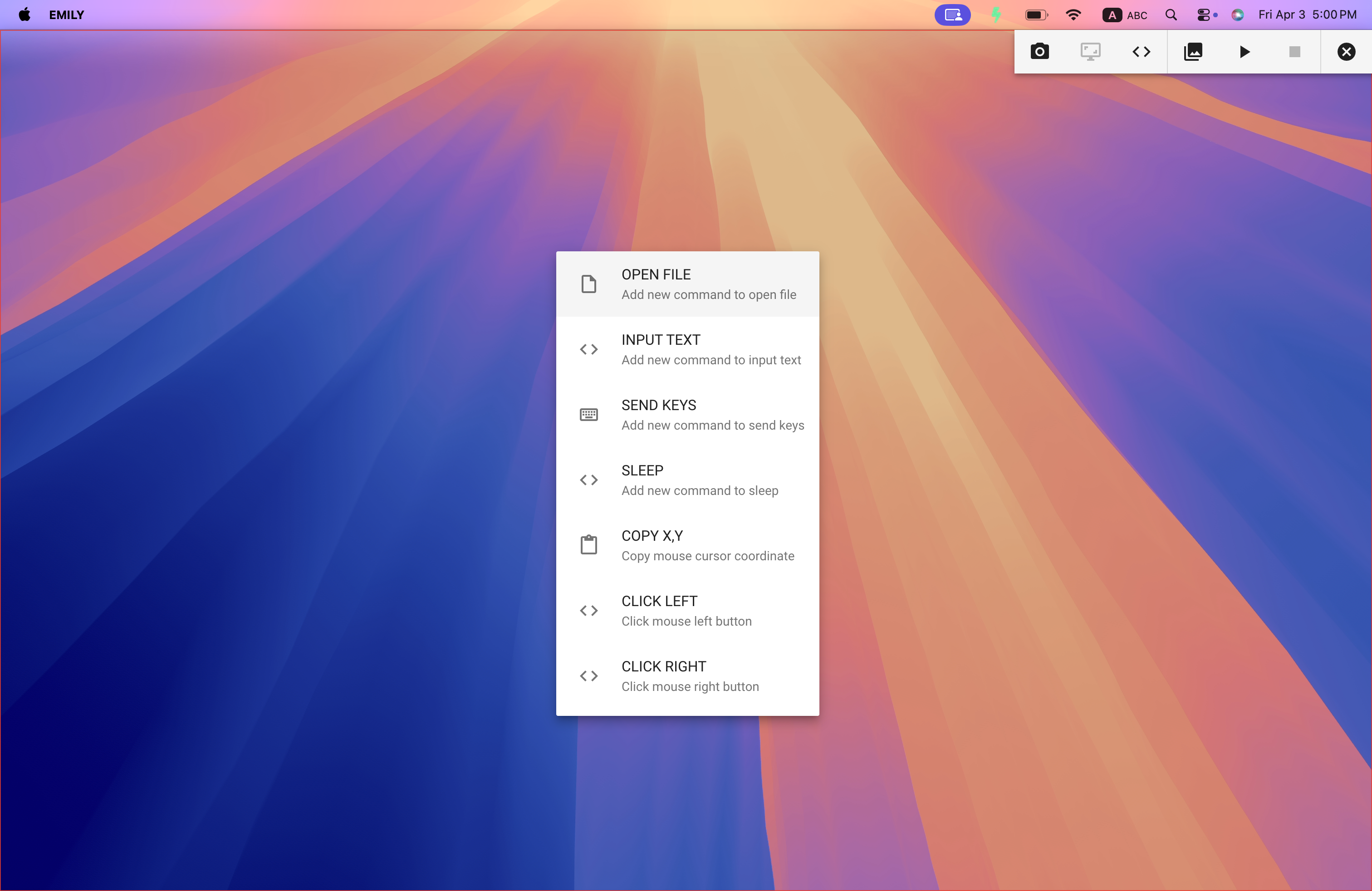 Menu commands include: "OPEN FILE", "INPUT TEXT", "SEND KEYS", "SLEEP", "COPY XY", "CLICK LEFT", "CLICK RIGHT", etc. "OPEN FILE" can either double-click a specified file to launch the associated application, or directly select an application executable to launch the application.