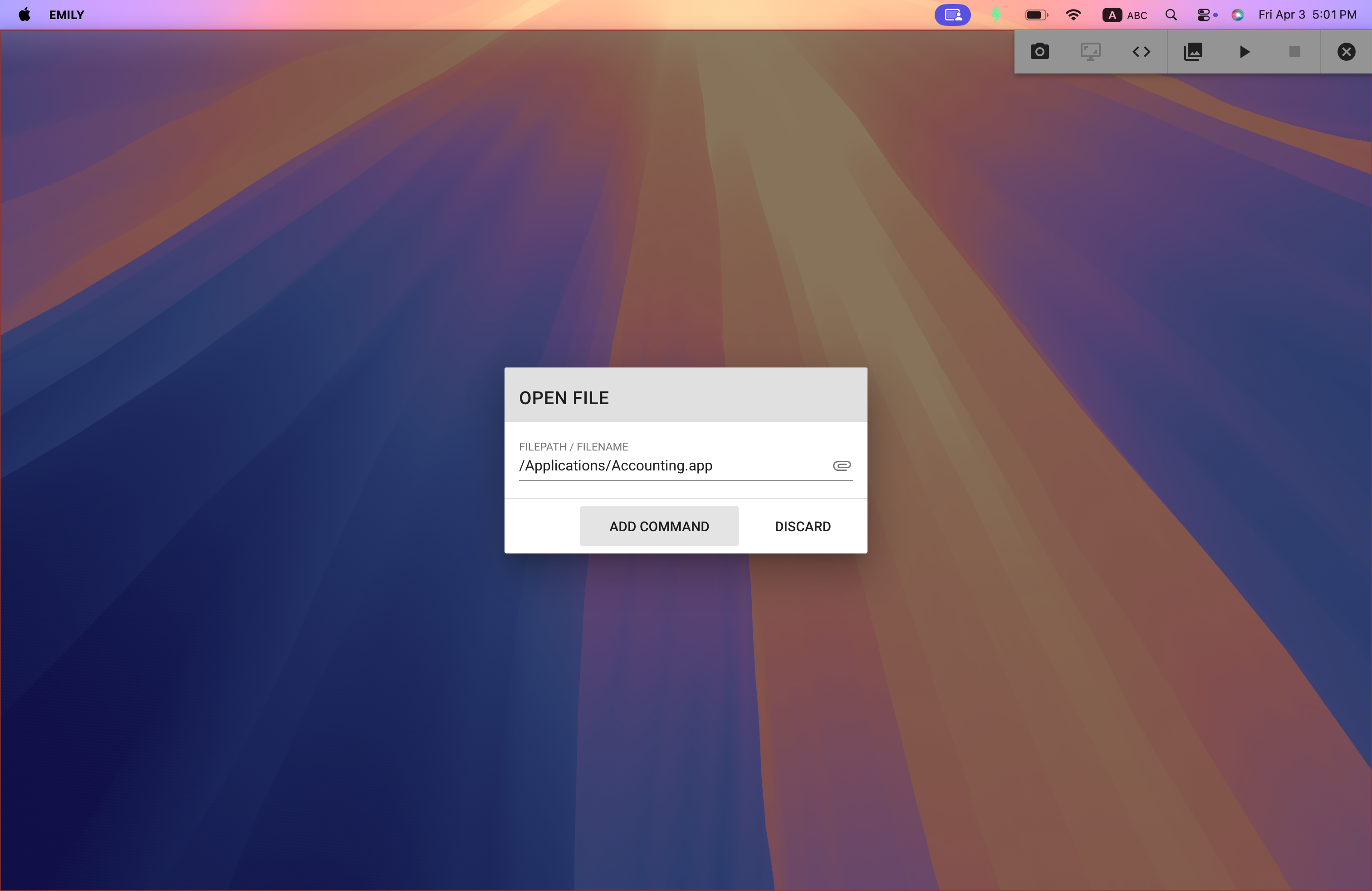For example, click "OPEN FILE" to add a command to open the accounting software Accounting.app.