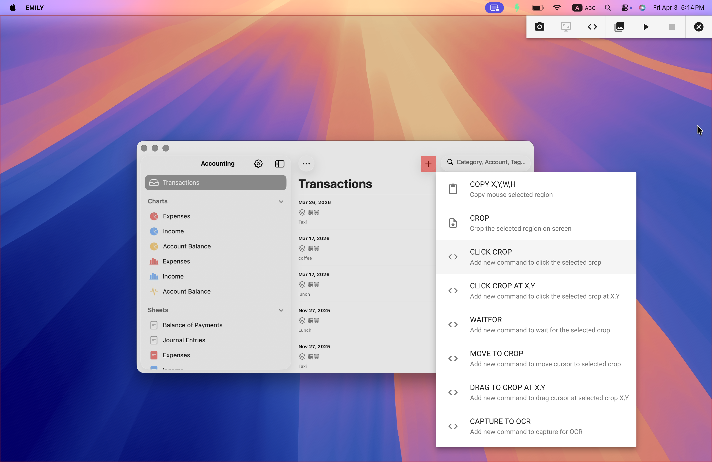 Next, you can take a snapshot to get the latest screen image, then switch back to the No-Code editor to continue adding the next command. Drag an area over a button on the screen image with the mouse, release the mouse to bring up the command menu, and select "CLICK CROP" to add a command. This command makes EMILY.RPA find the selected reference pattern (CROP) on the screen and then perform a mouse click. Commands that need to find a specified pattern on the screen will generate a reference image in the working folder, with filenames in the format CROP-xxx.png.