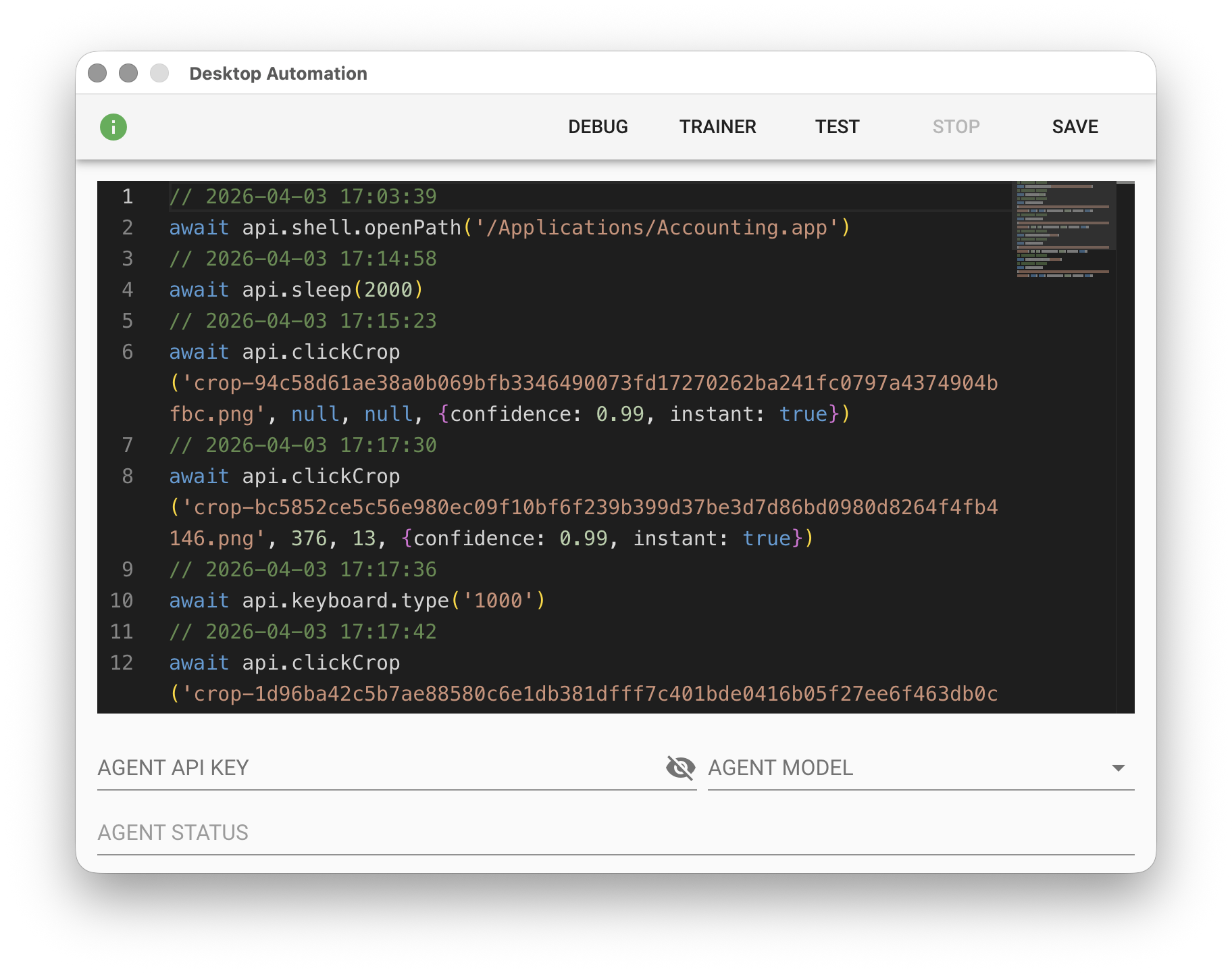 This module uses computer vision technology to analyze the screen and locate reference pattern coordinates, then operates the mouse and keyboard to automate desktop applications. When deploying skills that include desktop automation, the computer screen settings (such as resolution, color depth, text scaling, etc.) should be consistent with those used during training mode. It is recommended to design the workflow directly on the deployment computer and avoid operating the computer during execution to prevent mouse and keyboard interference.
