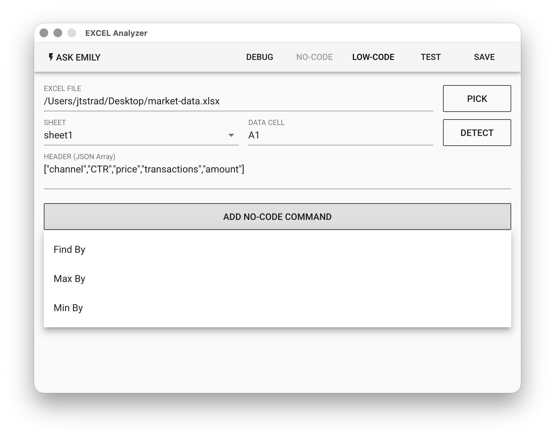 Provides No-Code commands such as: "Find By", "Max By", and "Min By". For example, find the data row in the specified table where the source column contains google, and write each column of that row to working folder documents.