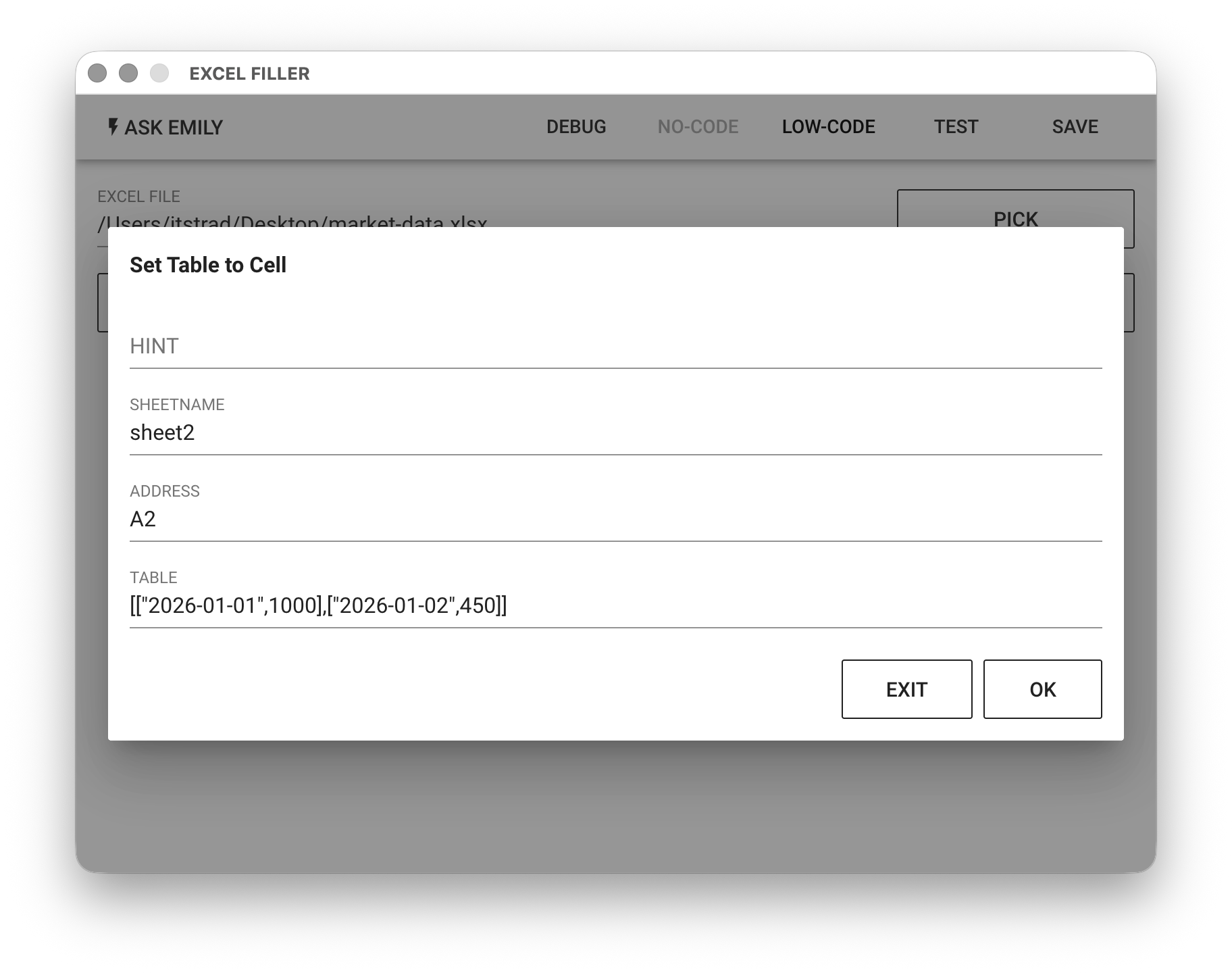 Provides No-Code commands such as: "Set Cell Value", "Set Range Value", "Set Table to Cell". For example, insert a two-dimensional table at position A2 in sheet2, where A2 is 2026-01-01, B2 is 1000, A3 is 2026-01-02, and B3 is 450.