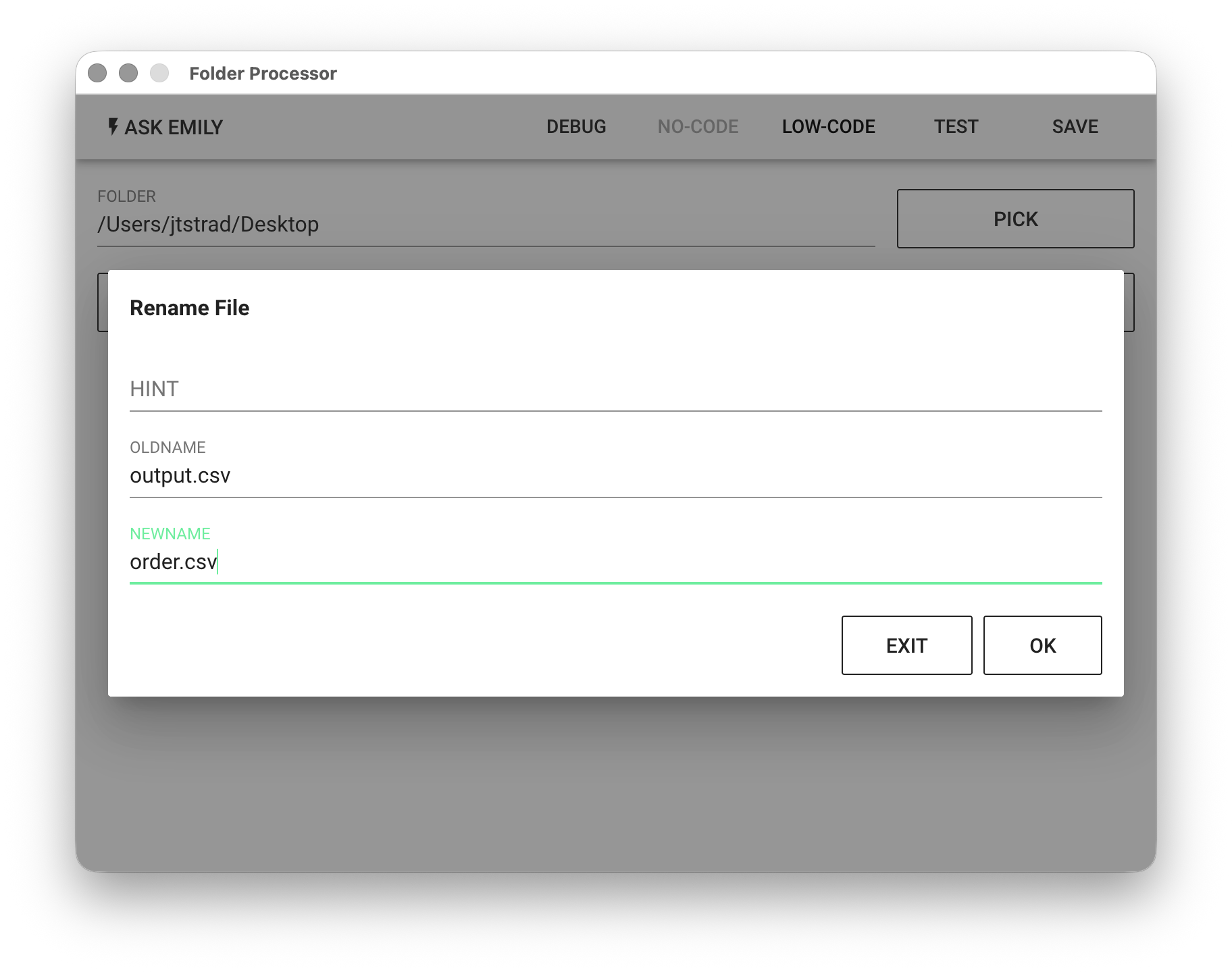 Provides no-code commands such as: "Rename File", "Delete File", "Create Folder", etc. For example, rename the file output.csv to order.csv in the specified folder.
