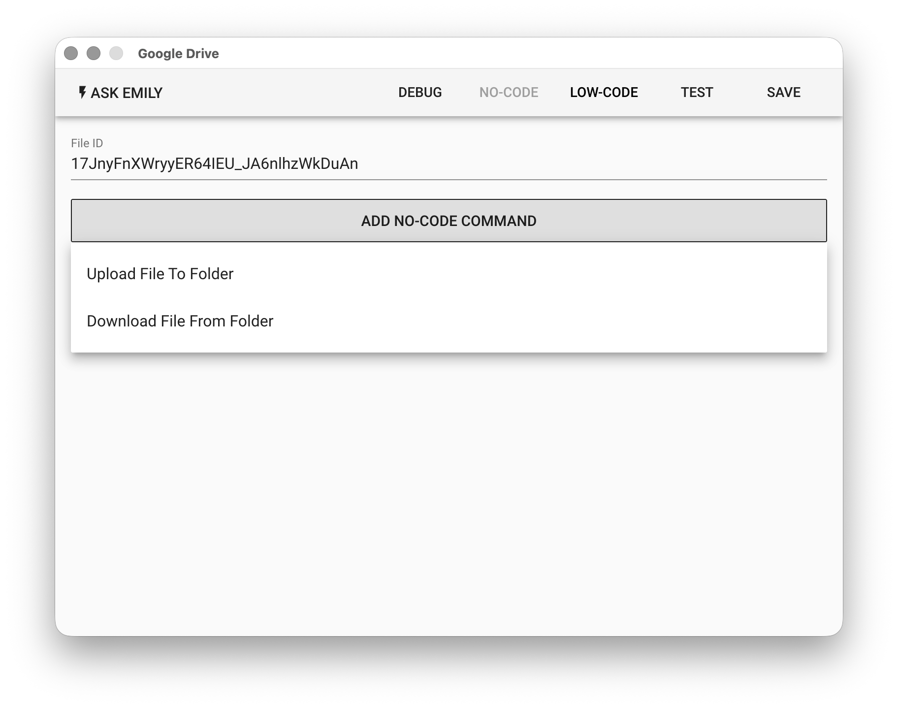 Provides no-code commands such as: "Upload File to Folder" and "Download File from Folder". For example, upload the order.pdf file from the working folder to a specified Google Drive folder.