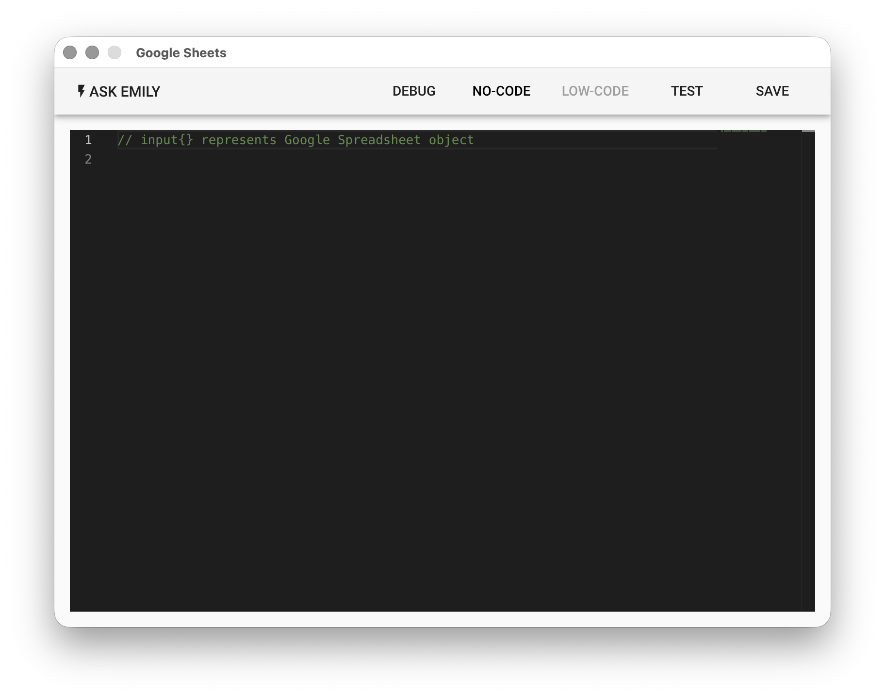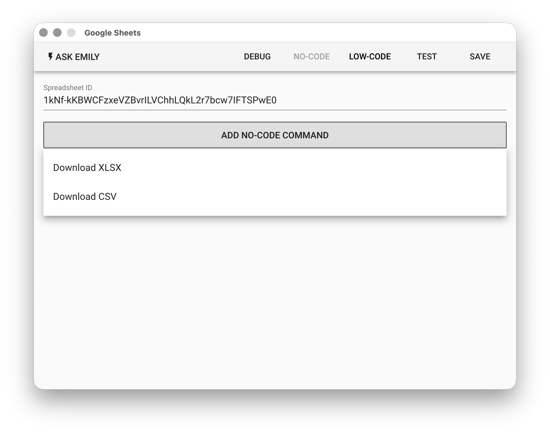 Provides no-code commands such as: "Download XLSX" and "Download CSV". For example, download the sheet1 sheet from the specified Google Spreadsheet file to the output.csv file in the working folder.