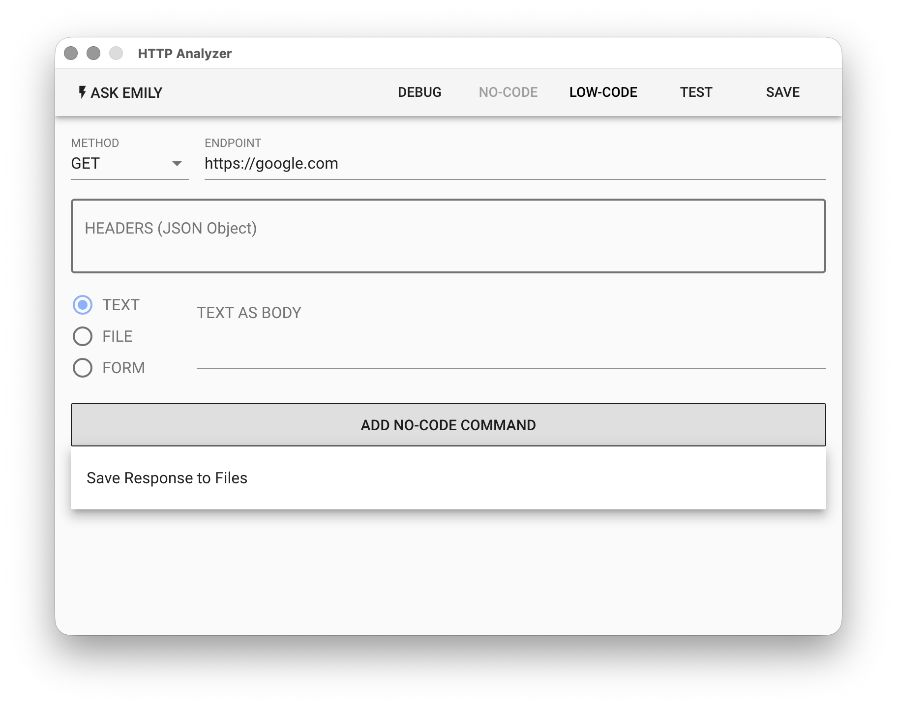 Provides no-code commands such as "Save response content as file". For example, "Save response content as file" can write the response's url, status, headers, contentType, body to a document in the working folder.