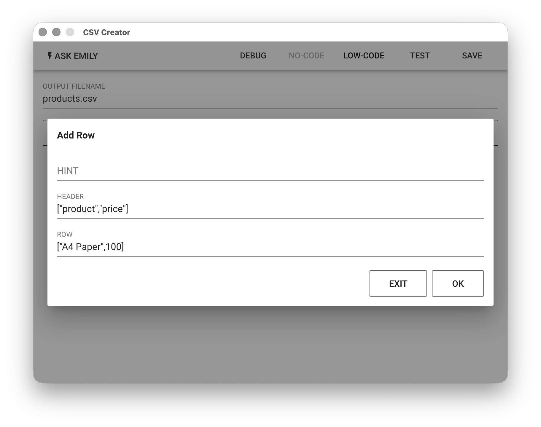 Provides No-Code commands such as: "Add a Record". For example, add a record with the field product set to A4 Paper and the field price set to 100.