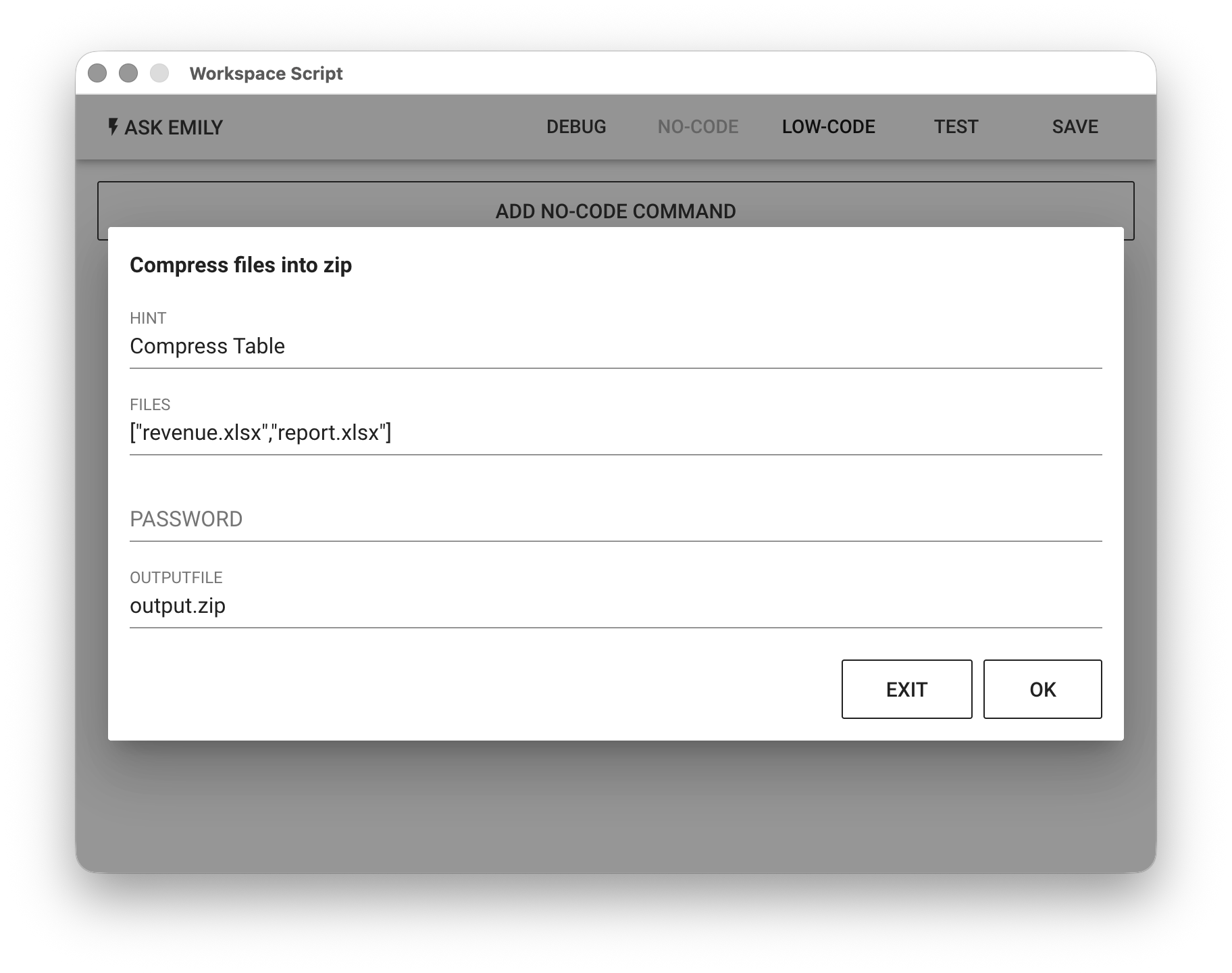 For example, to compress files in the working folder into a ZIP file, select "Compress Specified Files". Then arrange the filenames to compress in JSON array format in the FILES field. After clicking "OK", this No-Code command is recorded in the module's command list.