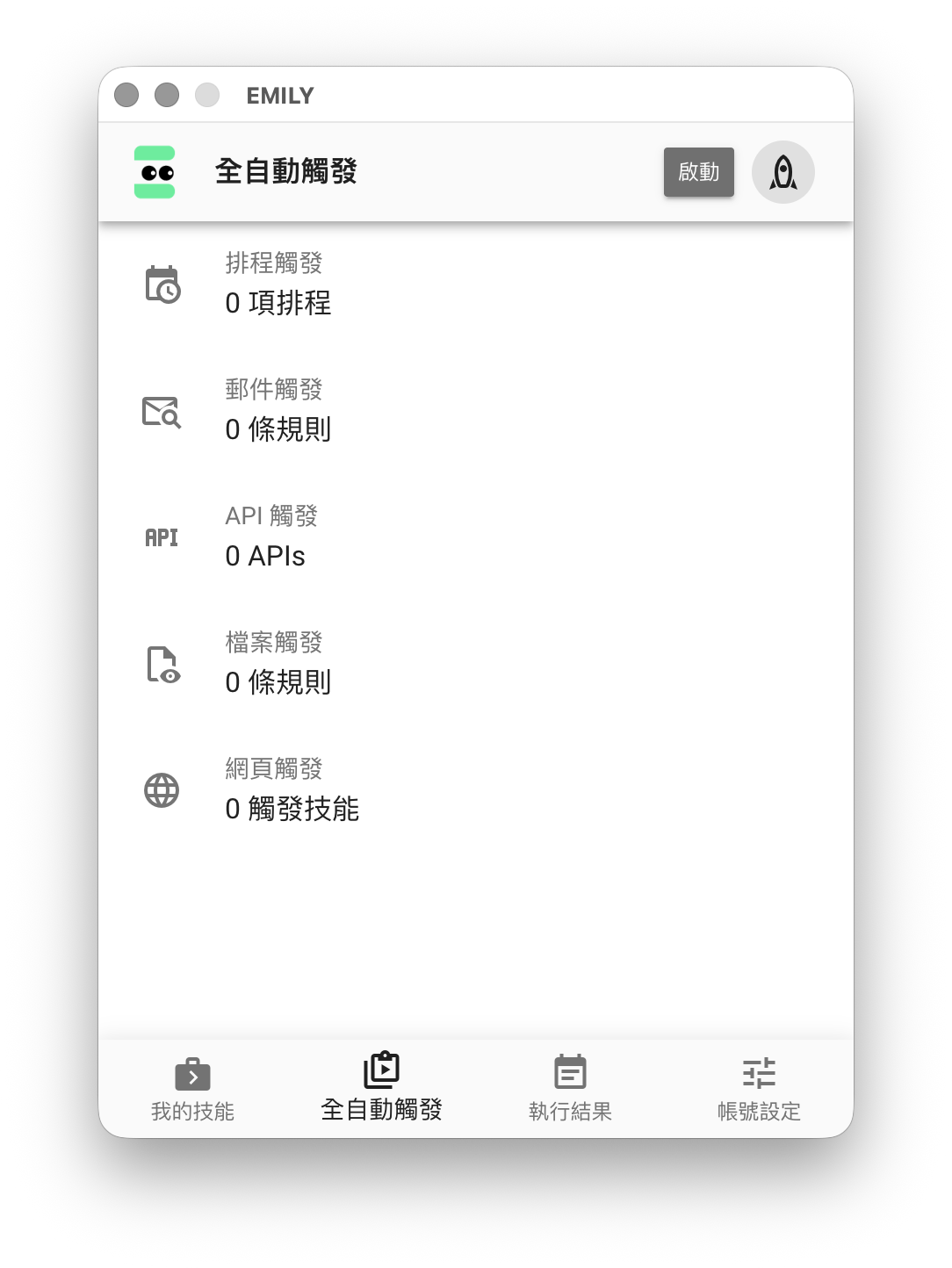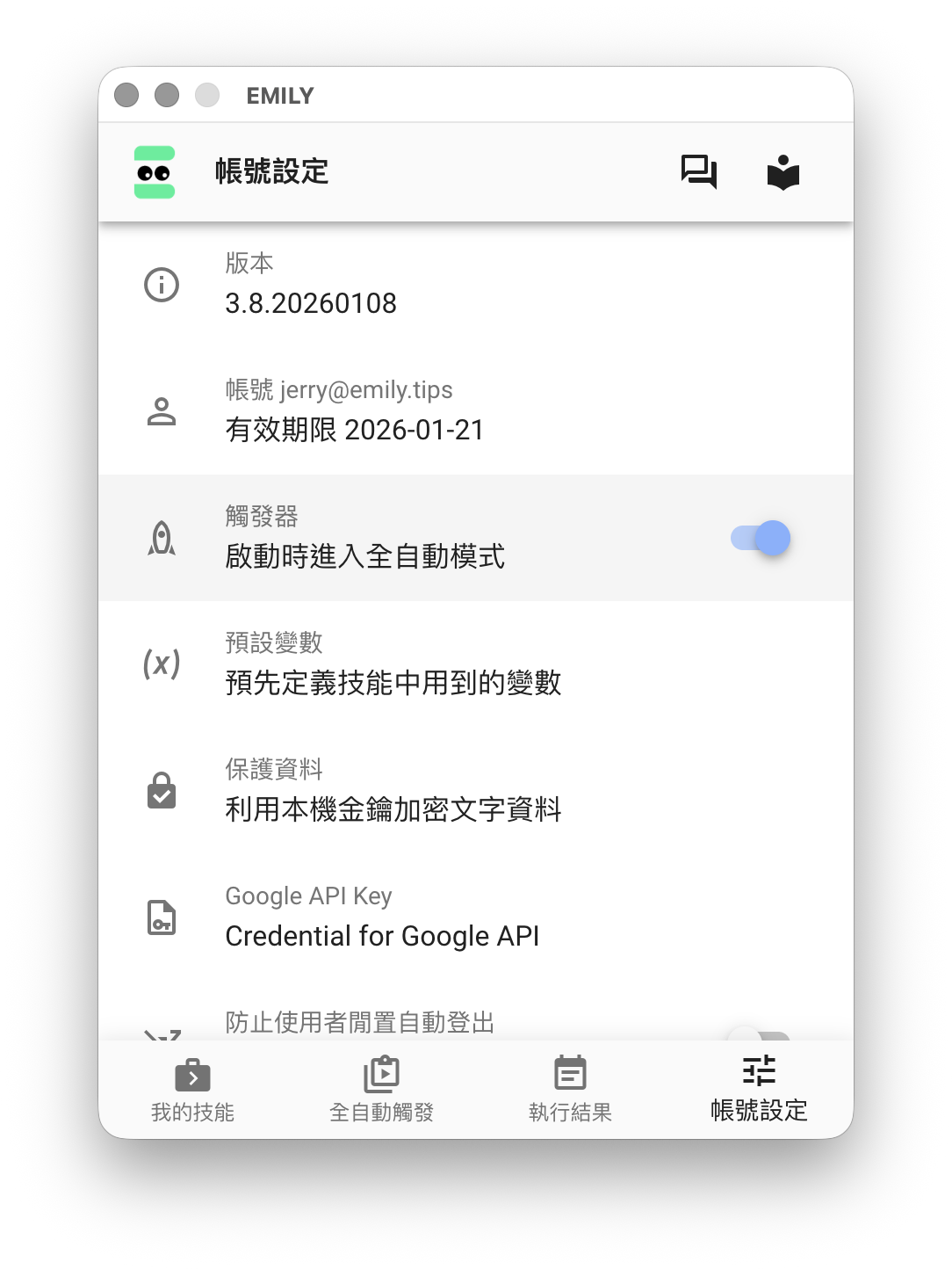 如果希望 EMILY.RPA 一啟動就進入全自動模式,可以在「帳號設定」功能頁中打開「啟動時進入全自動模式」。其他各種觸發的設定可以參考個別觸發頁面的介紹。