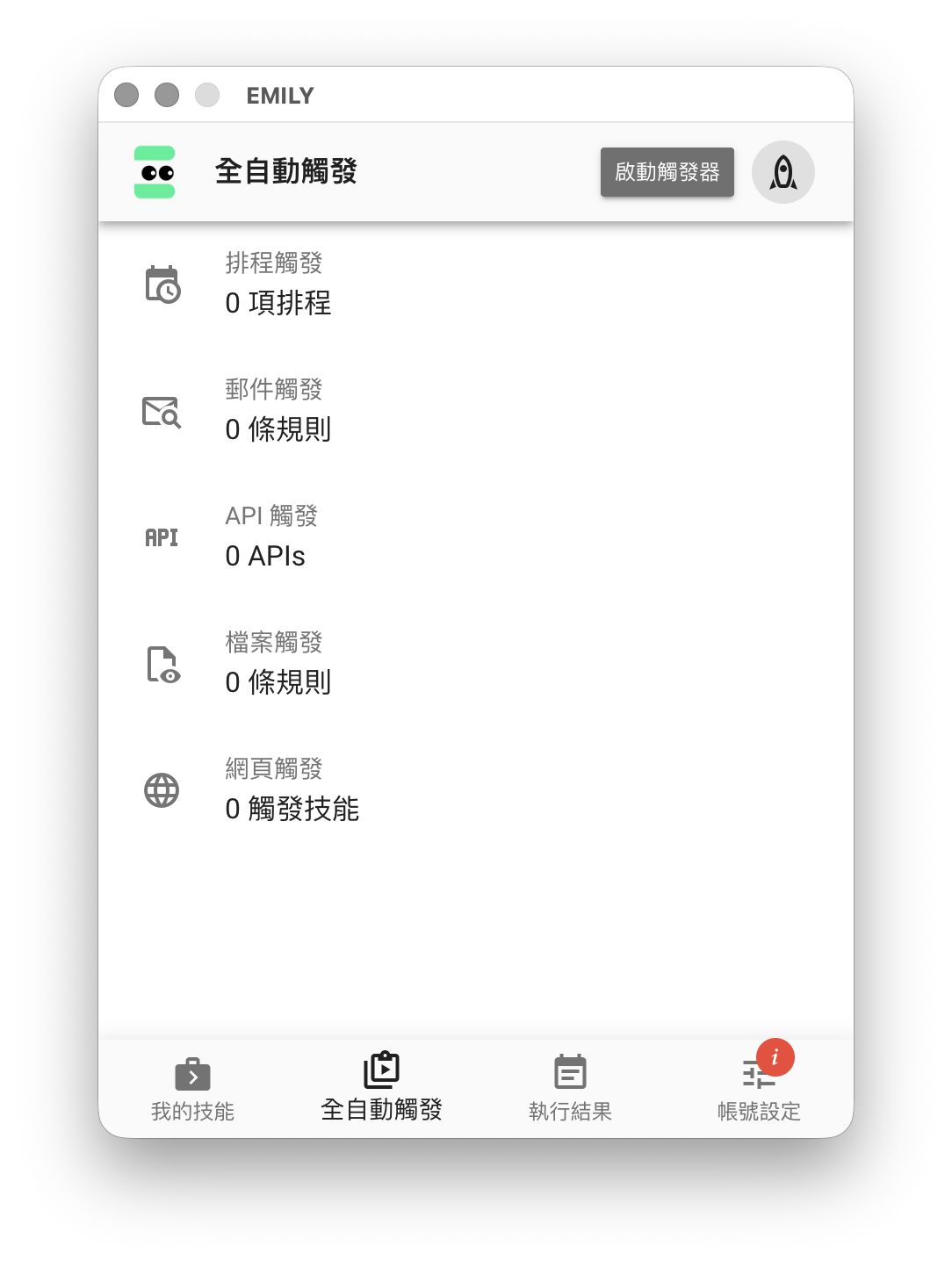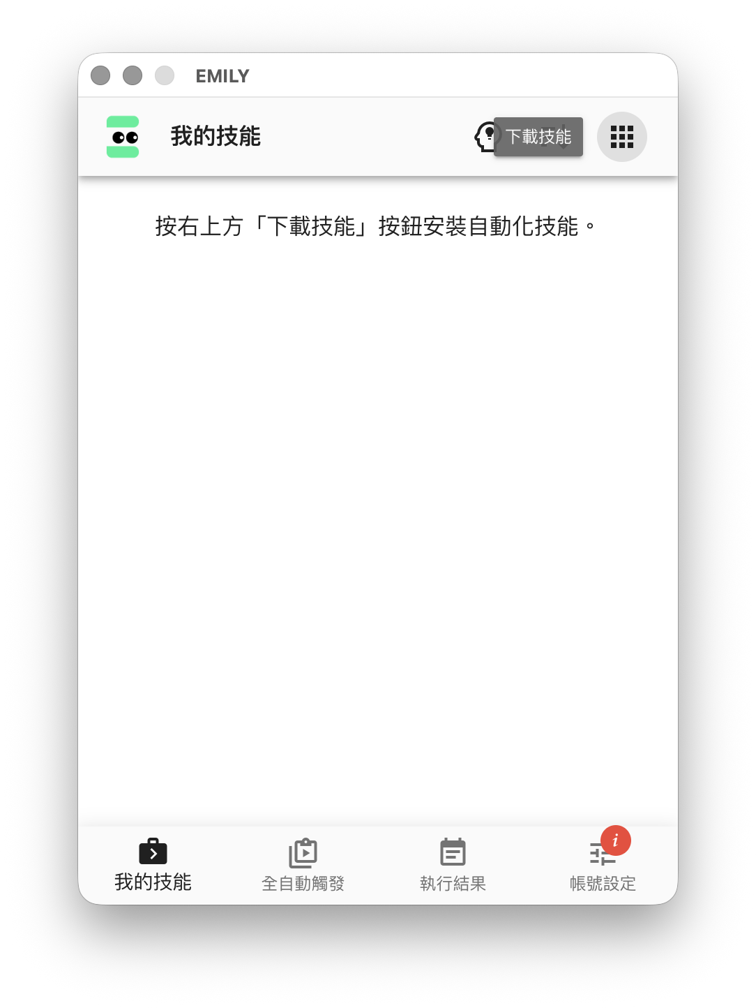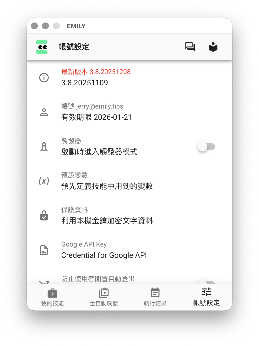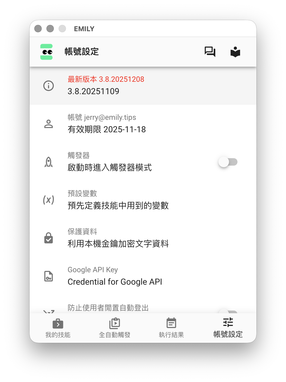 EMILY.RPA 主界面的頁尾是主要功能選擇區,可以切換成「我的技能」,「全自動觸發」,「執行結果」與「帳號設定」四個功能頁,頁首及內容會隨著功能頁的同而改變。隨著使用累積資訊,可以拖曳視窗左右邊界增加寬度,但高度是固定無法改變的。