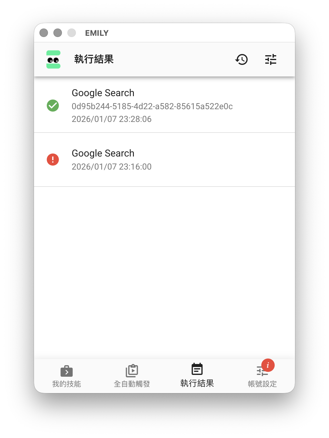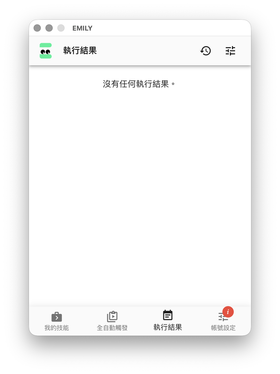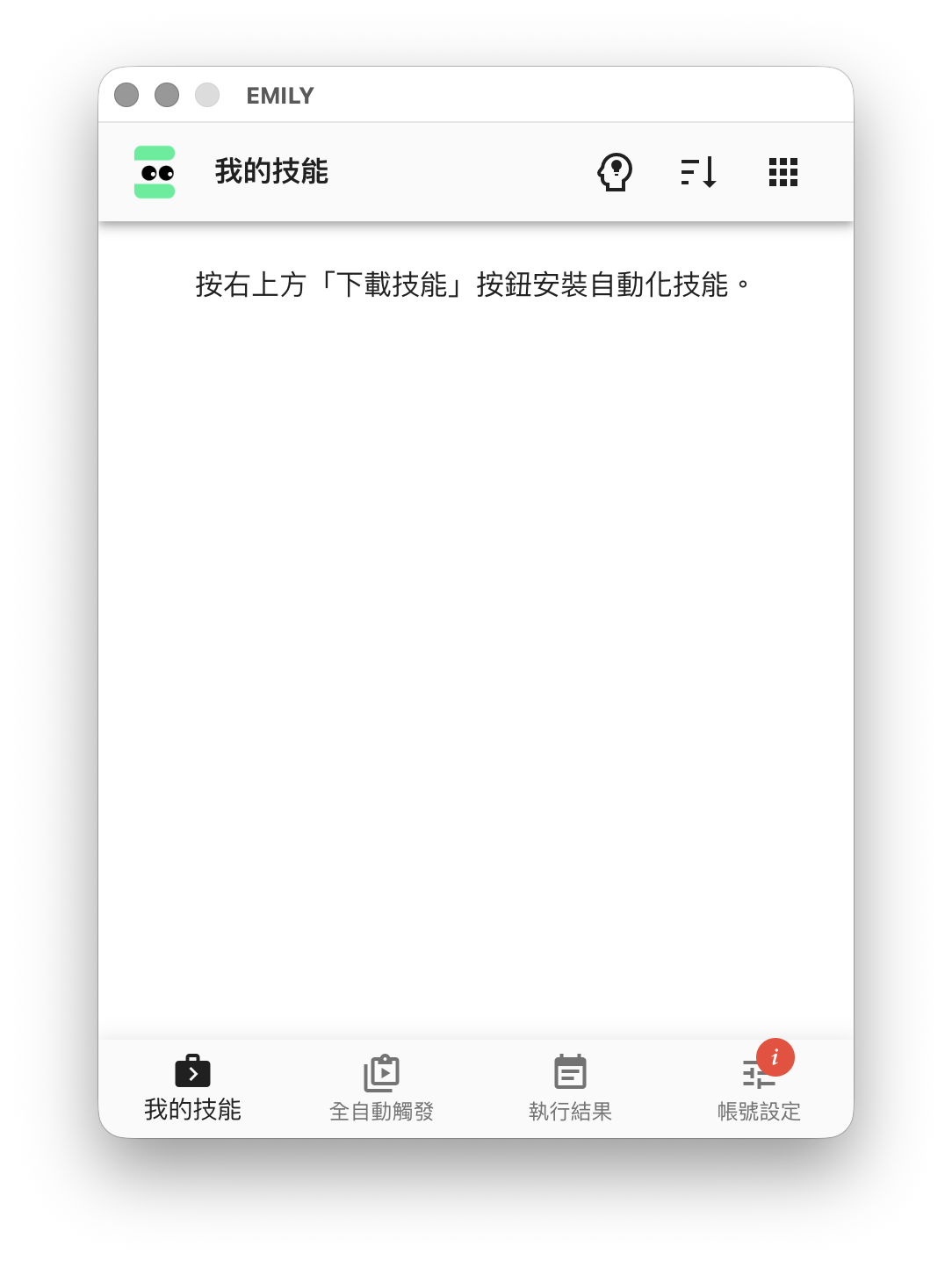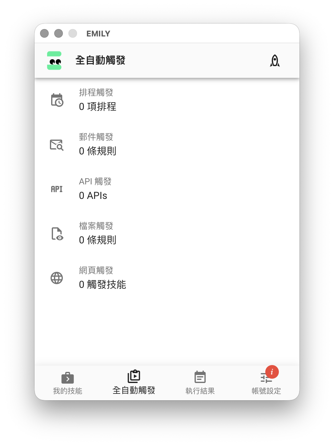 EMILY.RPA 主界面的頁尾是主要功能選擇區,可以切換成「我的技能」,「全自動觸發」,「執行結果」與「帳號設定」四個功能頁,頁首及內容會隨著功能頁的同而改變。隨著使用累積資訊,可以拖曳視窗左右邊界增加寬度,但高度是固定無法改變的。