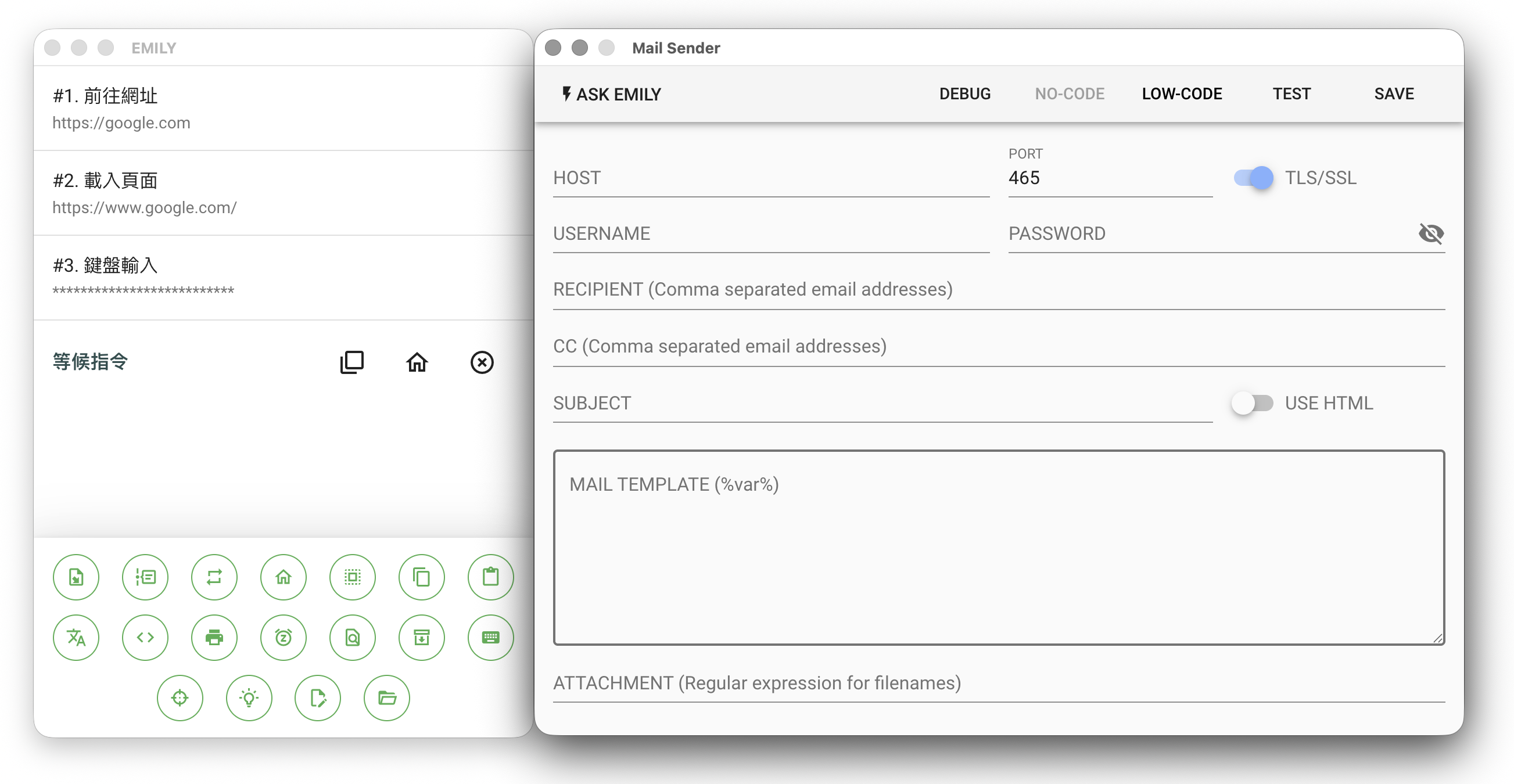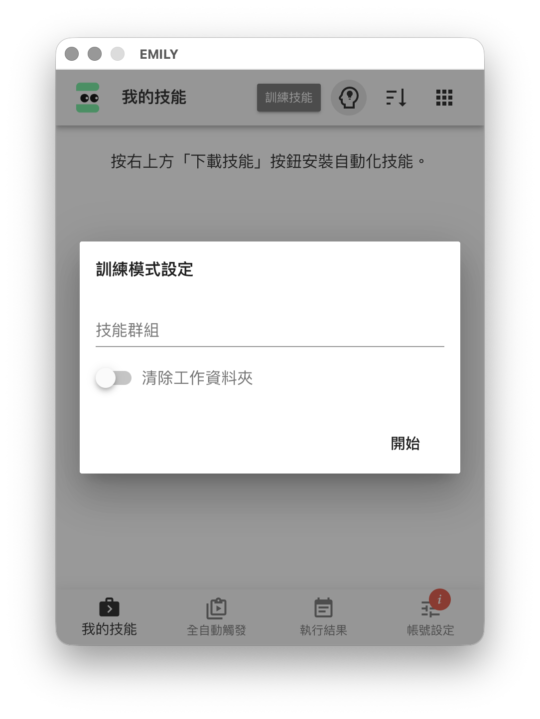 EMILY.RPA 將「自動化流程」稱為「技能」,而功能頁「我的技能」就是用來管理本機上的所有技能。點擊頁首「訓練技能」圖示會進入訓練模式,按 ESC 鍵或滑鼠點擊對話框以外區域可以取消。在「訓練模式設定」中可以為技能所屬的 技能群組 命名,空白也是一個群組,同一個群組會共享同一個瀏覽器 cookie 資料庫,這在需要登入的網站很有用,通常這些網站在登入後會將狀態寫入 cookie 以保持登入的狀態。在 EMILY.RPA 中每一次技能執行時會配置對應的「工作資料夾」,訓練模式下開發技能時,「工作資料夾」會固定在一個名為 tmp 的資料夾,這是為了方便開發技能時可以簡化輸出入檔案的管理與重複使用,清除工作資料夾 會將 tmp 資料夾中檔案都刪除;但在執行模式下,每一次技能的執行都會新產生一個專屬的「工作資料夾」,這是為隔離不同執行的結果,並讓使用者可以回溯存取該次執行的輸出入檔案。