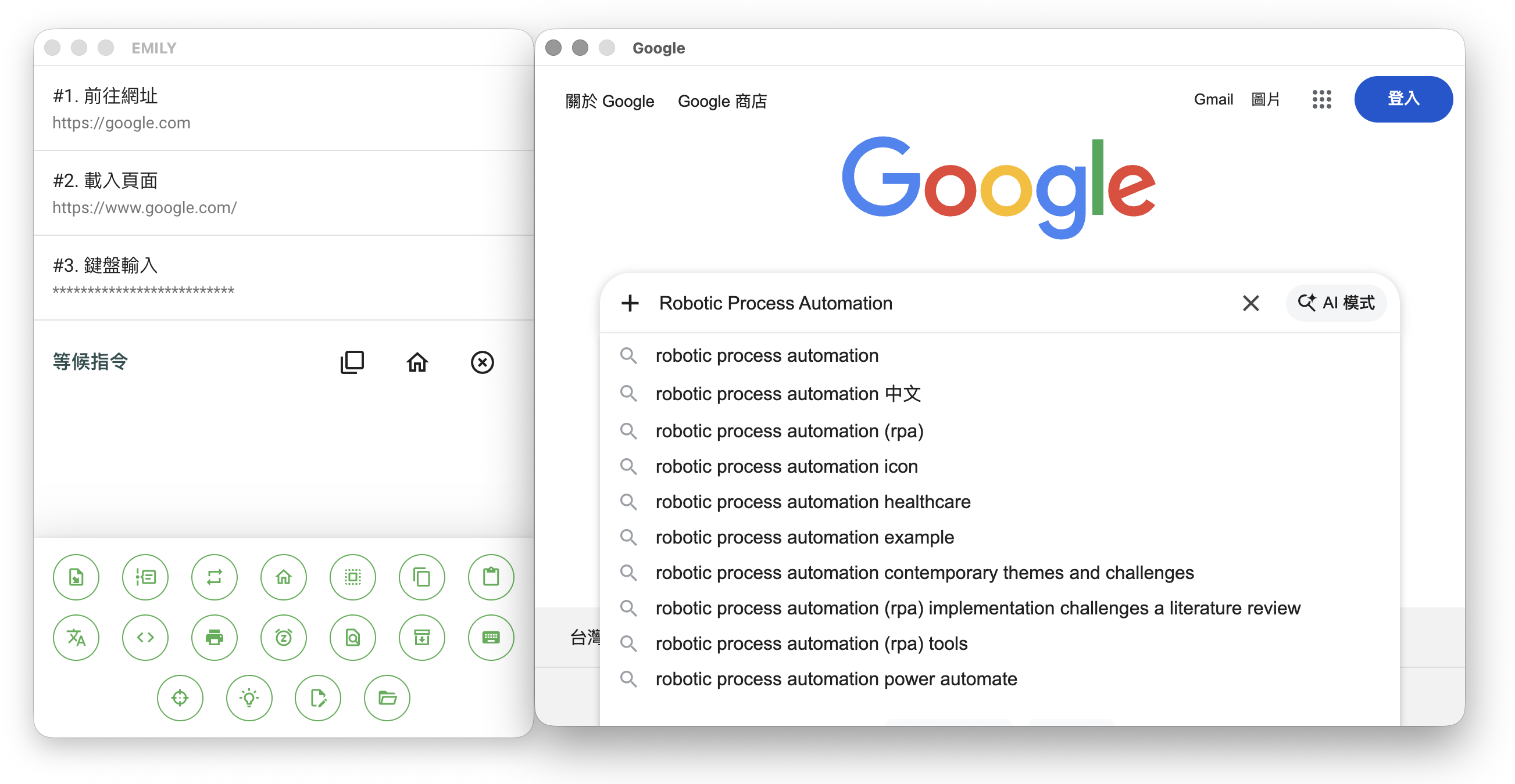 完成「訓練模式設定」後,會開啟一個訓練用的瀏覽器視窗,使用者可以在 Web Automation 網址列填入目標網頁的網址來開始網頁自動化的流程設計,或選擇下方的自動化模組,此時主界面轉為流程步驟新增、修改、刪除的功能。