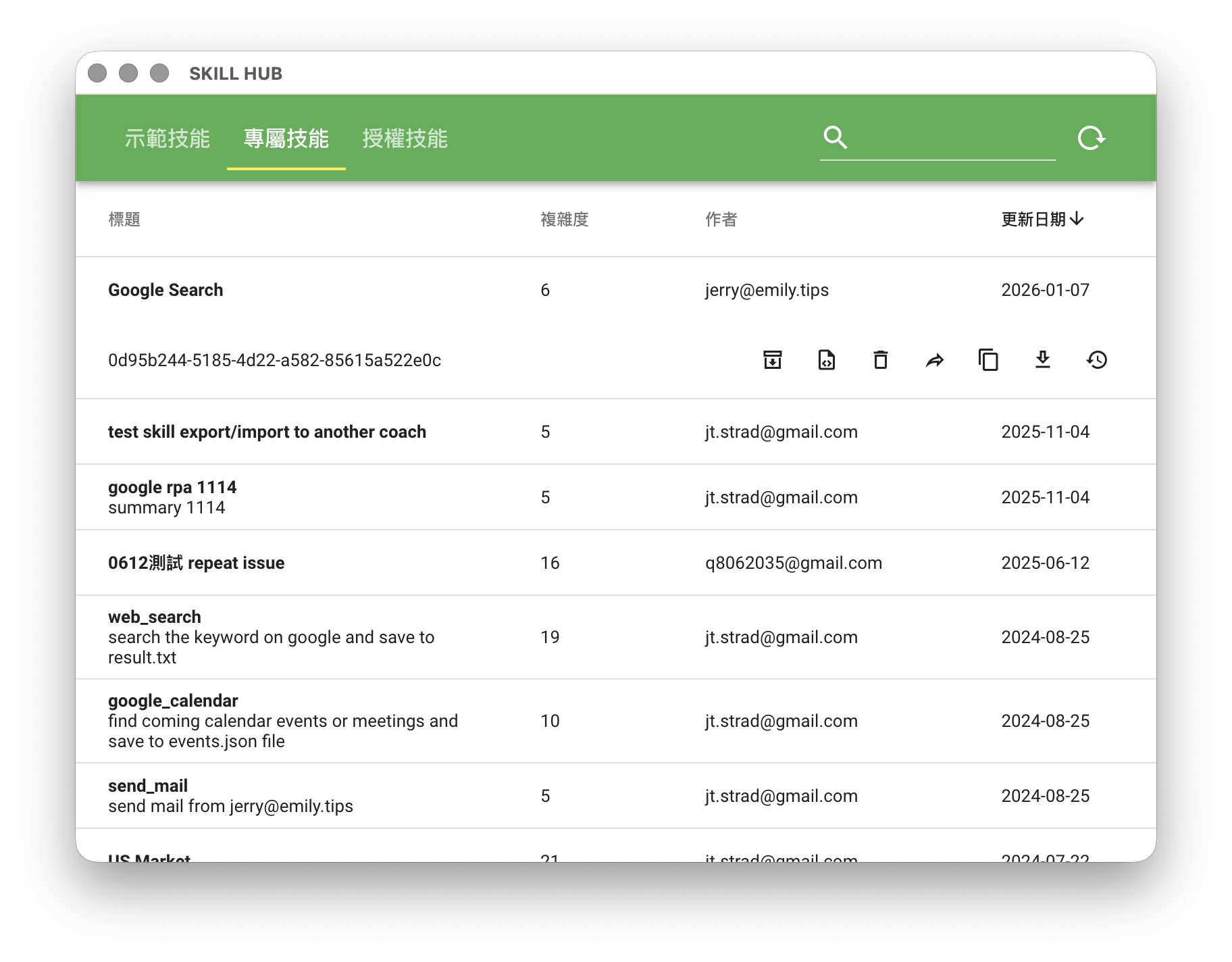 在「我的技能」頁首的「下載技能」圖示是技能庫的入口,技能庫(Skill Hub)保存著使用者開發的所有技能,以及企業群組中其他使用者分享的技能,本機端刪除的技能可以從技能庫重新下載安裝。如果有選購企業群組,技能每次上傳都會加入版本歷史,達到版本控制的目的。