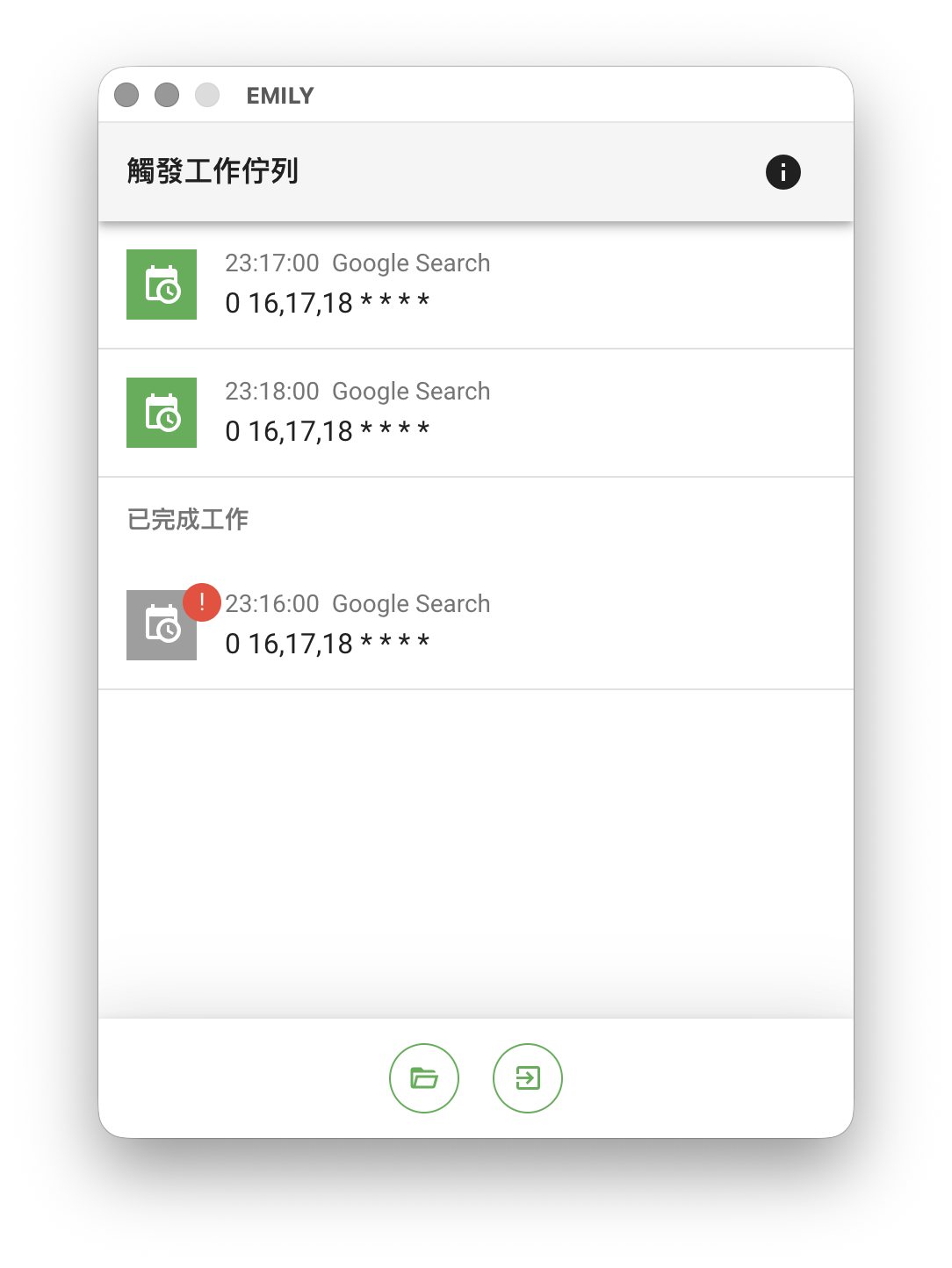 進入全自動模式後,所有符合觸發條件的技能會被排入工作佇列中依序執行,一次執行一個工作,在退出全自動模式前無法使用 EMILY.RPA 的其他功能以確保全自動模式的穩定,例如修改觸發規則或是進入「訓練模式」都需要退出全自動模式。