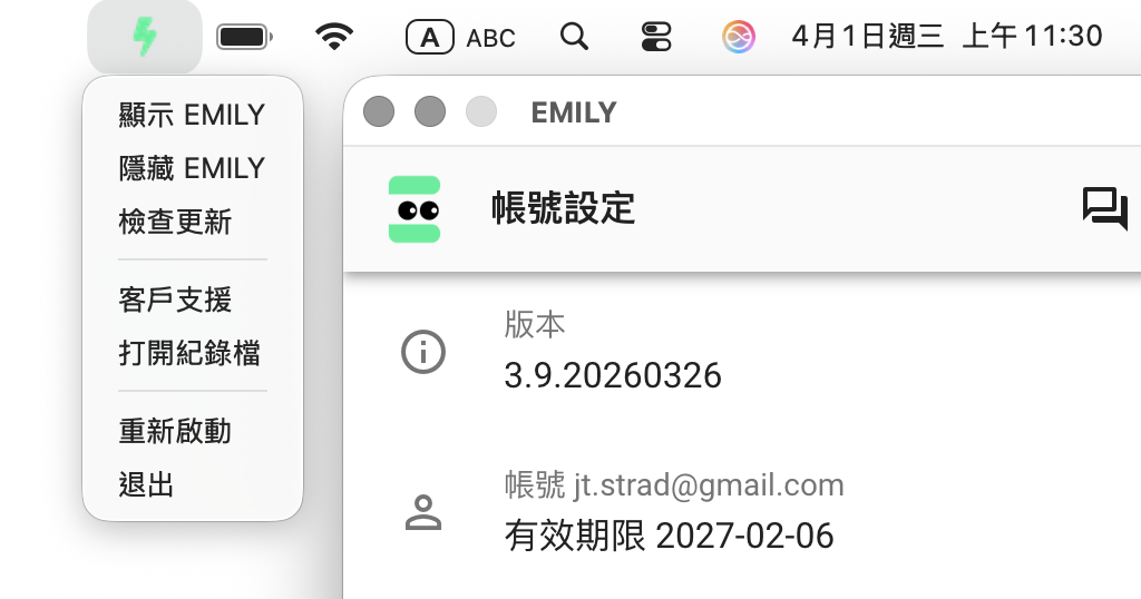 在 MacOS 桌面上方的選單列或 Windows 桌面下方的系統匣可以找到一個閃電圖示,點擊閃電開啟選單後可以「顯示」或「隱藏」 EMILY.RPA 的使用介面,此時您可以使用桌面而 EMILY.RPA 會在背景執行。需注意在執行「桌面自動化」功能時 EMILY.RPA 會控制滑鼠鍵盤操作桌面,使用者如果也在操作會相互干擾,也容易造成自動化執行失敗。選單中的「檢查更新」可以立即檢查是否有更新版本,另外 EMILY.RPA 開啟時也會自動觸發檢查。點擊「客戶支援」選項會開啟網頁提供使用者發送客戶支援請求,但僅限於產品使用與收費方式等非技術性問題。