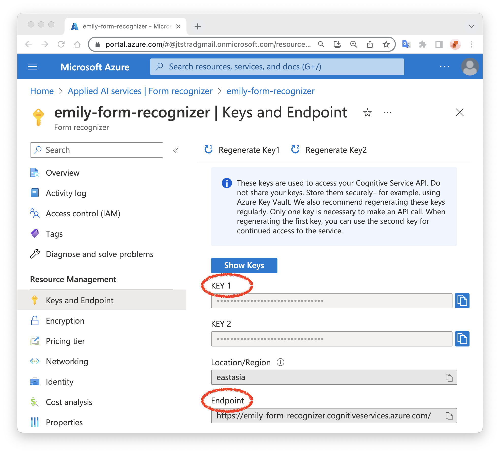 最後將建立好的表格辨識器服務端點與金鑰儲存備用: