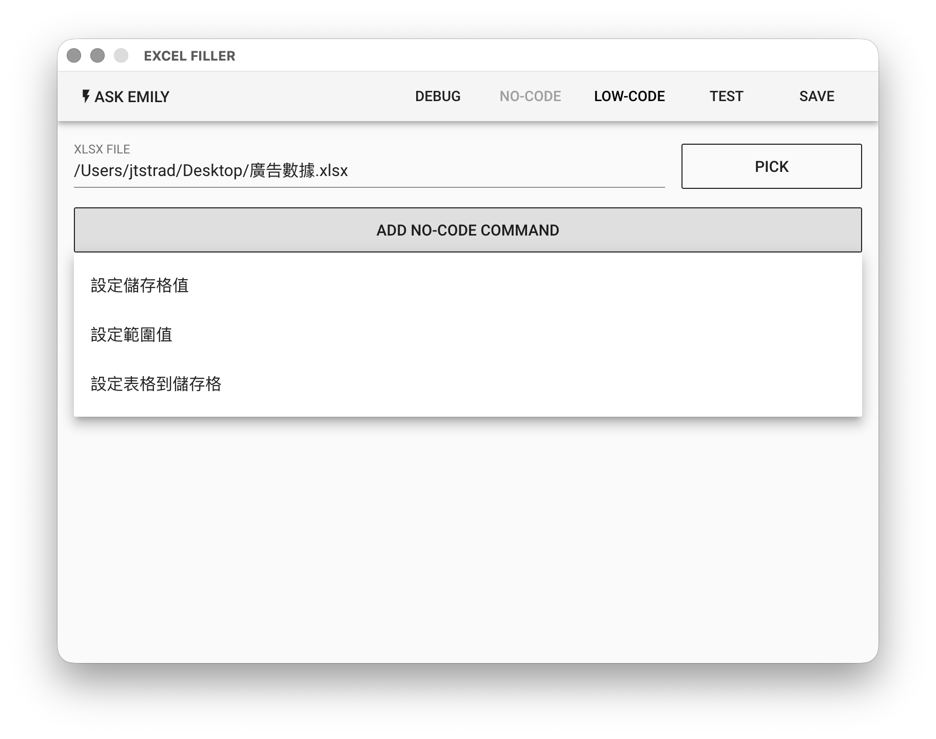 XLSX FILE - EXCEL XLSX 格式輸入檔,點擊「PICK」選取檔案、鍵盤輸入工作資料夾中的 EXCEL 檔名,或使用 %FILENAME% 變數。