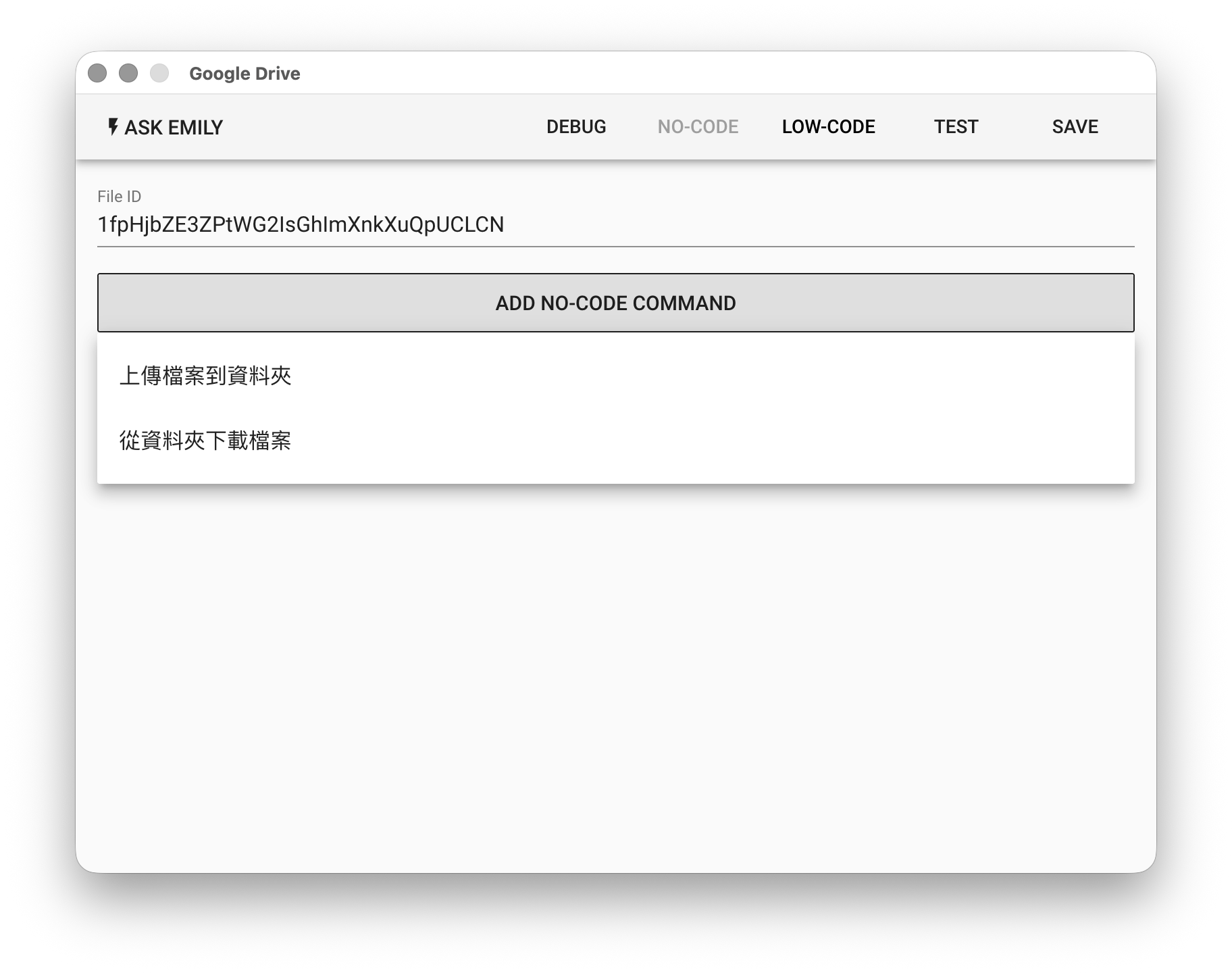 提供:「上傳檔案到資料夾」、「從資料夾下載檔案」等無程式碼指令。例如,將工作資料夾中的 order.pdf 檔案上傳到 Google Drive 指定資料夾。