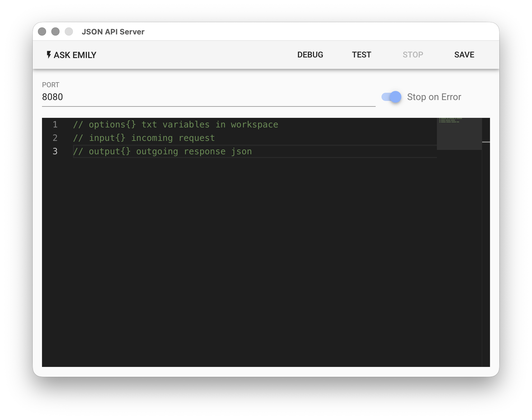 建立一個可回覆 JSON 物件資料格式的 HTTP API 伺服器。請注意,由於這個模組是伺服器,除非請求方發送 DELETE 的請求或設定錯誤時停止伺服器並遇到錯誤,否則模組會保持等待請求。