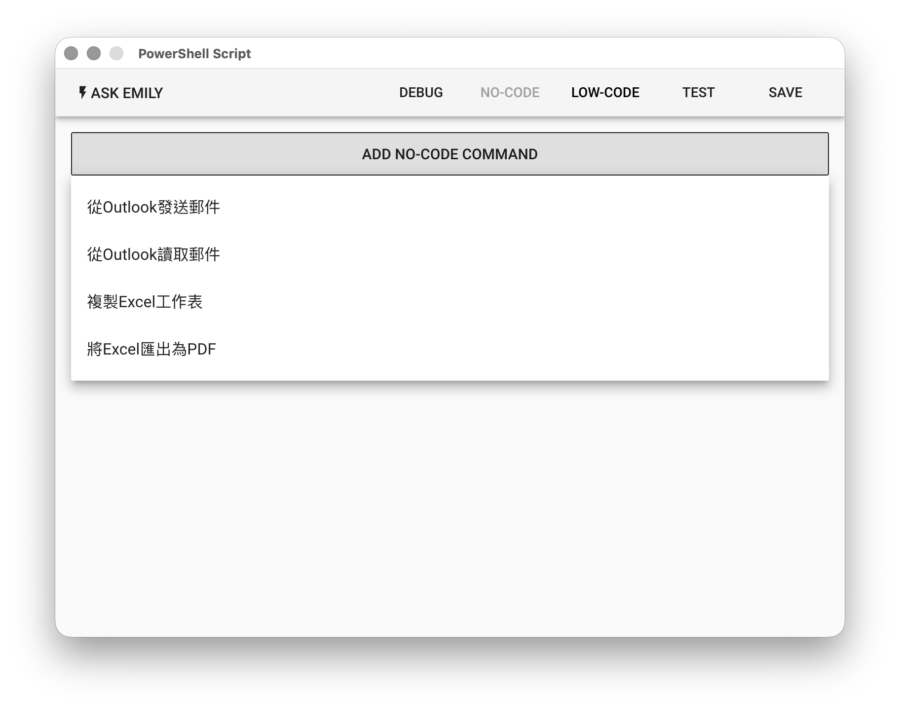 提供:「從Outlook發送郵件」、「從Outlook讀取郵件」、「複製Excel工作表」、「將Excel匯出爲PDF」等無程式碼指令。