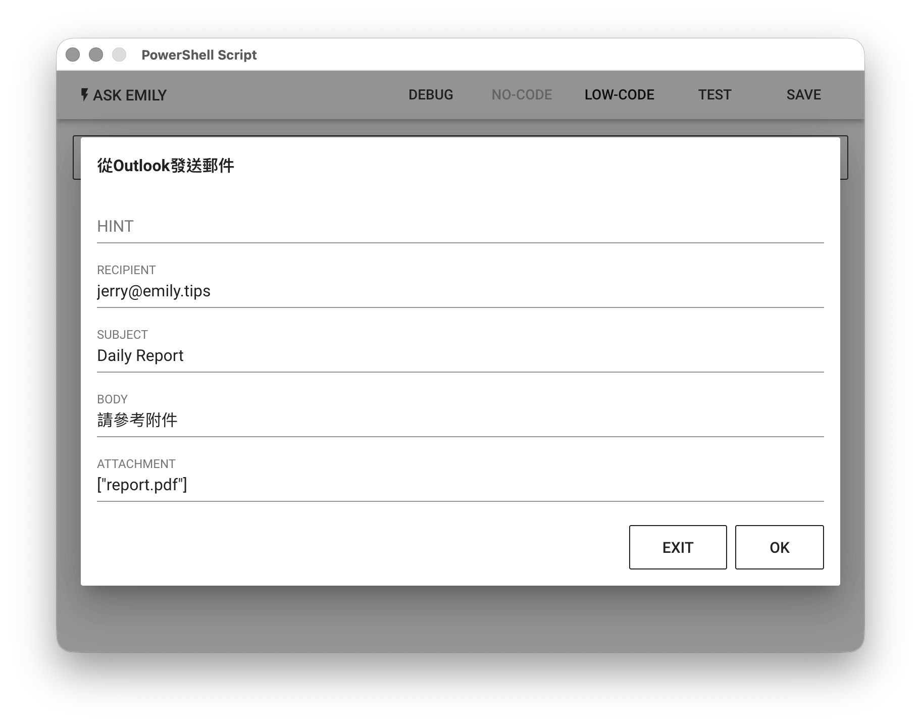 例如,從本機的 Outlook 應用程式發送郵件到執行信箱 jerry@emily.tips,郵件主旨為 Daily Report,內文為 請參考附件,附件為工作資料夾中的 report.pdf 檔案。