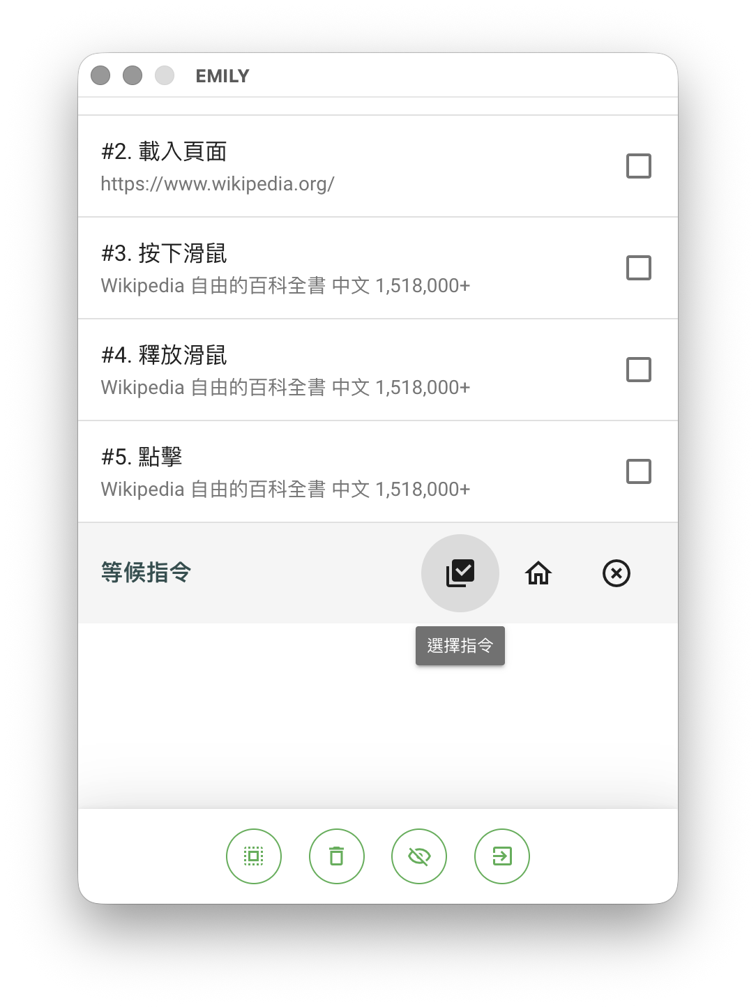 以滑鼠在瀏覽器頁面中選擇目標節點並輸入提示文字,在執行時期 EMILY 機器人到了這個步驟會暫停自動執行,並以紅色標識節點,同時主視窗顯示提示文字來引導用戶接手操作頁面,完成後點擊「完成了」讓機器人繼續自動執行。