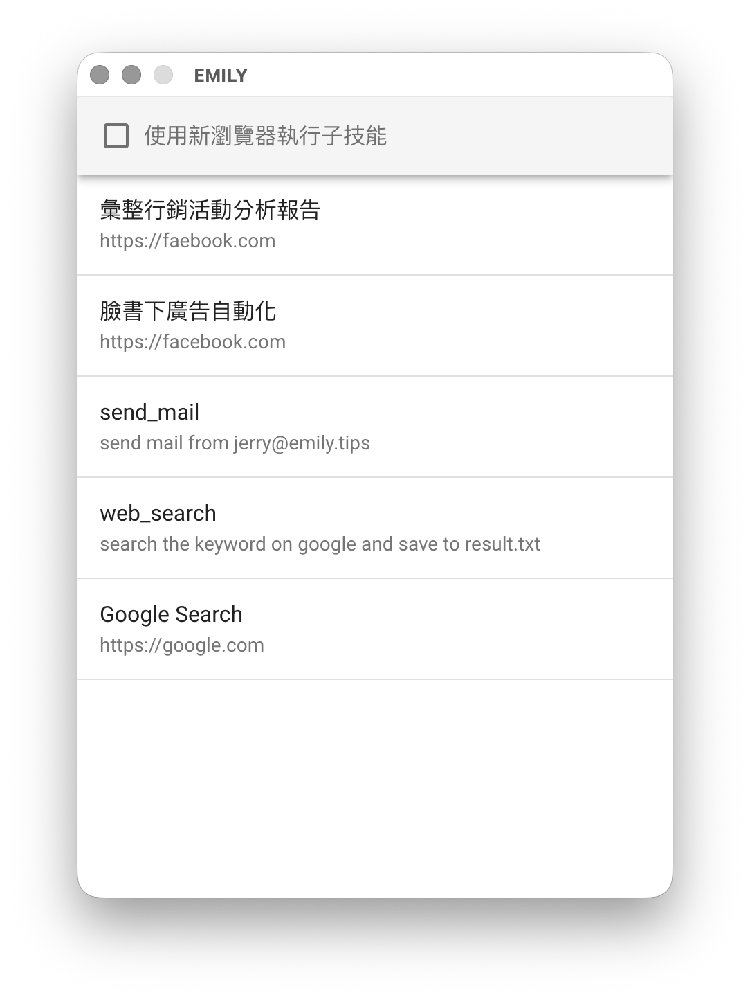 選擇一個技能,插入流程中成為一個步驟。當 EMILY 機器人執行到這個步驟,會將這個子技能中的所有步驟載入依序執行。勾選使用新瀏覽器執行子技能會在執行時期開啟一個新瀏覽器視窗執行選擇的子技能,而選擇的子技能也能有獨立的循環工作;若不勾選則子技能會執行在同一個瀏覽器視窗中,也需遵守禁止巢狀循環工作的規則。放棄插入子技能只要按鍵盤 ESC 鍵即可。